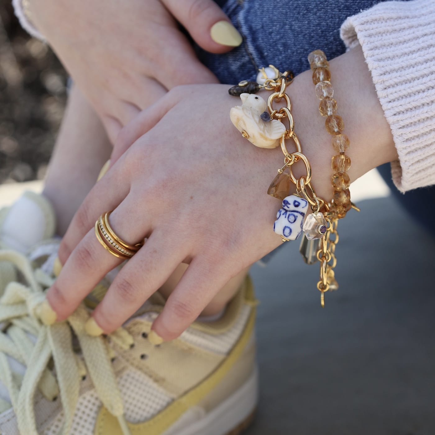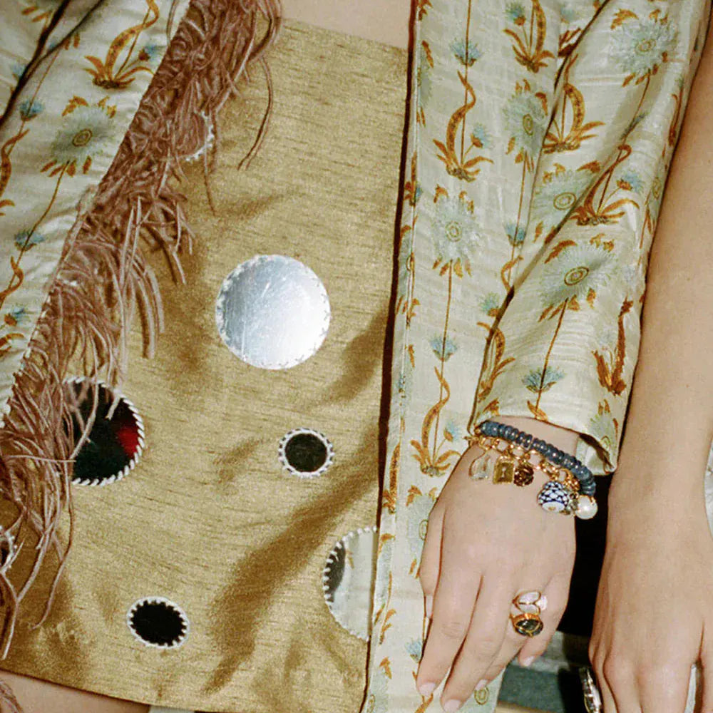 The Delft Charm Bracelet pairs whimsical porcelain charms with freshwater pearls and hand-cut gems on a chunky gold chain. Fastens with a gold lobster clasp.