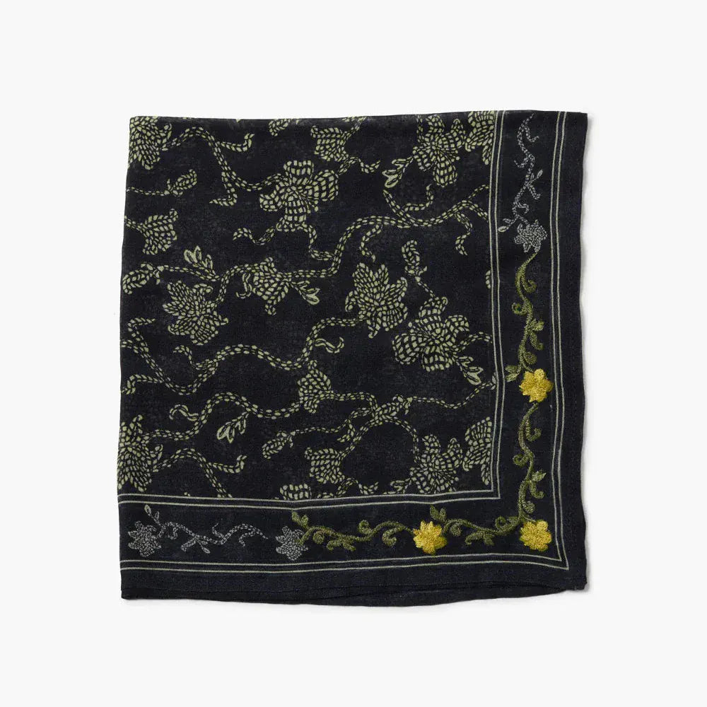 A 100% viscose bandana scarf featuring a kantha floral print and embroidered details along the edge.