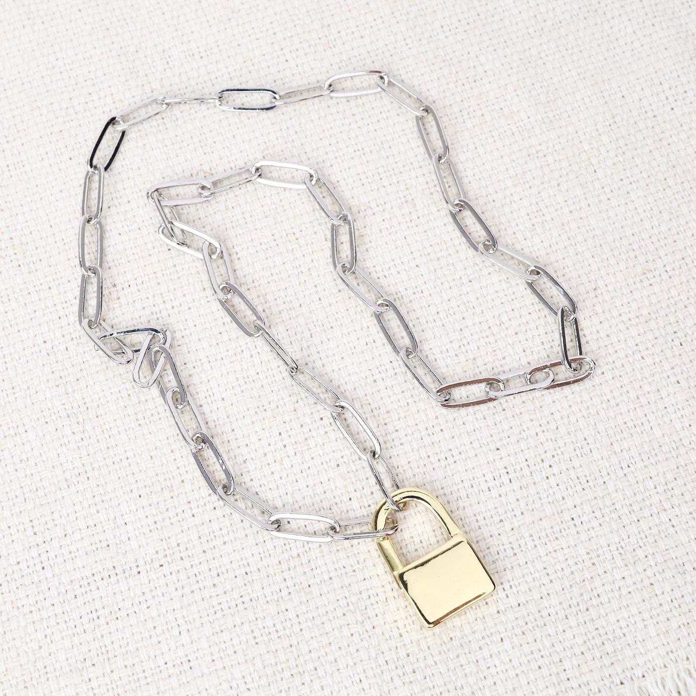 Unlock timeless elegance with this modern mixed-metal necklace. A sleek silver-plated chain meets a bold gold-plated padlock pendant, creating a striking contrast that blends minimalist sophistication with everyday edge. Perfect for layering or wearing solo, it adds a polished touch to any look.