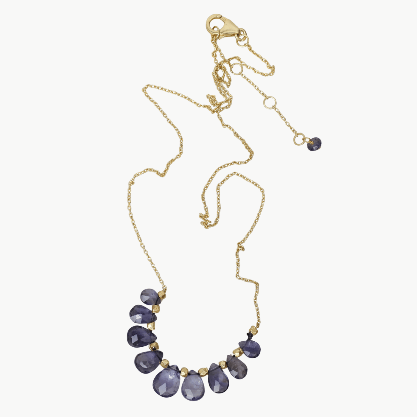 A graceful arc of deep violet iolite briolettes brings a touch of color and elegance to this delicate necklace. Faceted stones catch the light beautifully, complemented by warm gold accents for a refined yet modern look. Perfect on its own or layered with your favorite pieces.