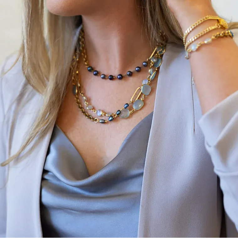 A striking mix of color, texture, and form, this necklace brings together a curated blend of gemstones along a warm gold chain. Moonstone, kyanite, aquamarine, chalcedony, and pearls are thoughtfully spaced throughout the design, each adding its own subtle hue and luminous character. The varied shapes and tones create natural visual intrigue, making this piece beautiful worn alone or layered with simpler chains for added dimension.
