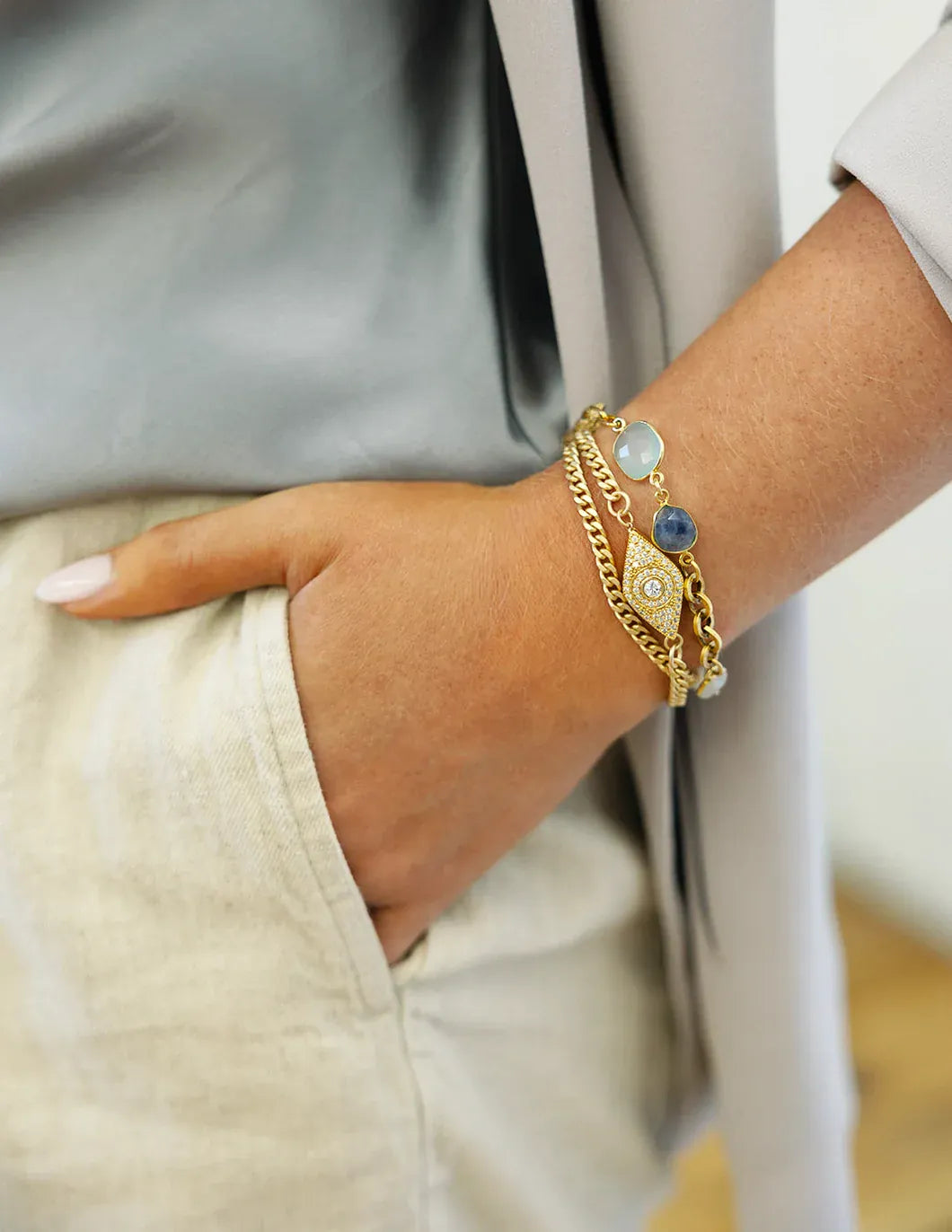 A modern mix of texture, chain, and luminous gemstones, this bracelet brings effortless style to everyday wear. Faceted moonstone, vibrant kyanite, and soft chalcedony are set along a gold-plated chain, creating a balanced design that feels both contemporary and timeless. The varied links and stones add visual interest while keeping the piece refined and versatile. Wear it alone for an understated statement or stack it with other favorites for a layered look.