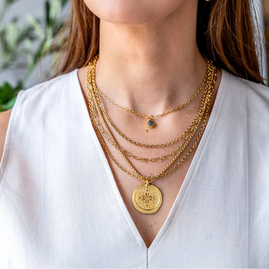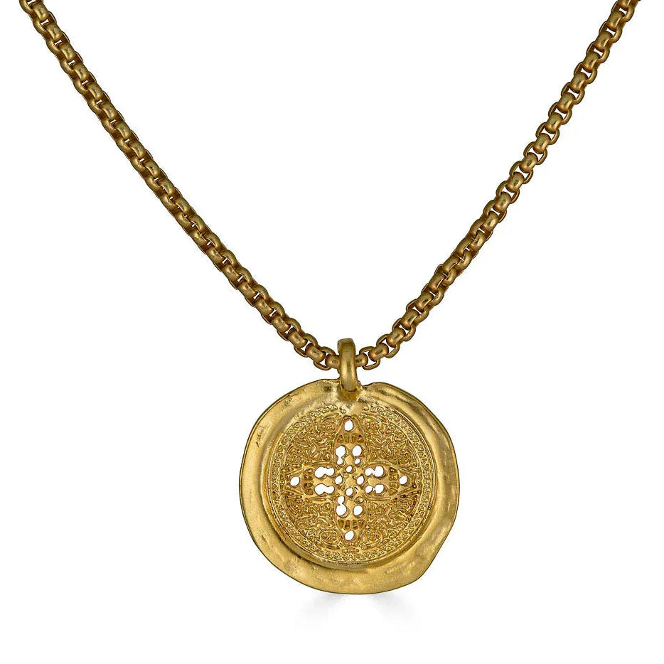 Refined with a hint of vintage inspiration, this matte gold necklace features a detailed coin pendant etched with a delicate filigree-style pattern. Suspended from a rounded box chain, the piece feels both substantial and elegant, offering a timeless look with modern simplicity. Beautiful worn alone or layered with other chains, it’s an effortless piece that complements everything from everyday outfits to more polished looks.