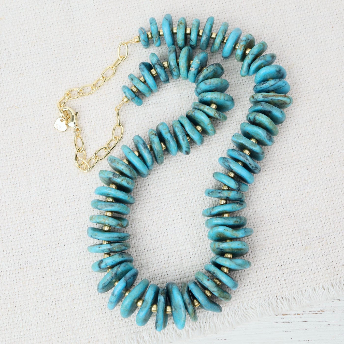 Bold and timeless, this chunky turquoise gemstone necklace captures the raw beauty of the desert landscape. Each natural magnesite turquoise bead is hand-selected for its vibrant blue-green hue and unique matrix patterns, resulting in a truly one-of-a-kind statement piece. Finished with a gold-filled clasp, this handmade design carries the spirit of sun, sand, and open skies wherever you go.