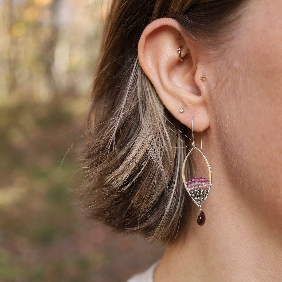 Delicate yet striking, these earrings showcase a graceful marquise silhouette adorned with layers of rhodolite garnet, pyrite, and strawberry quartz. The rich garnet teardrop dangle adds depth and movement, while the sterling silver setting provides a modern, polished finish. A statement of elegance with just the right amount of sparkle.