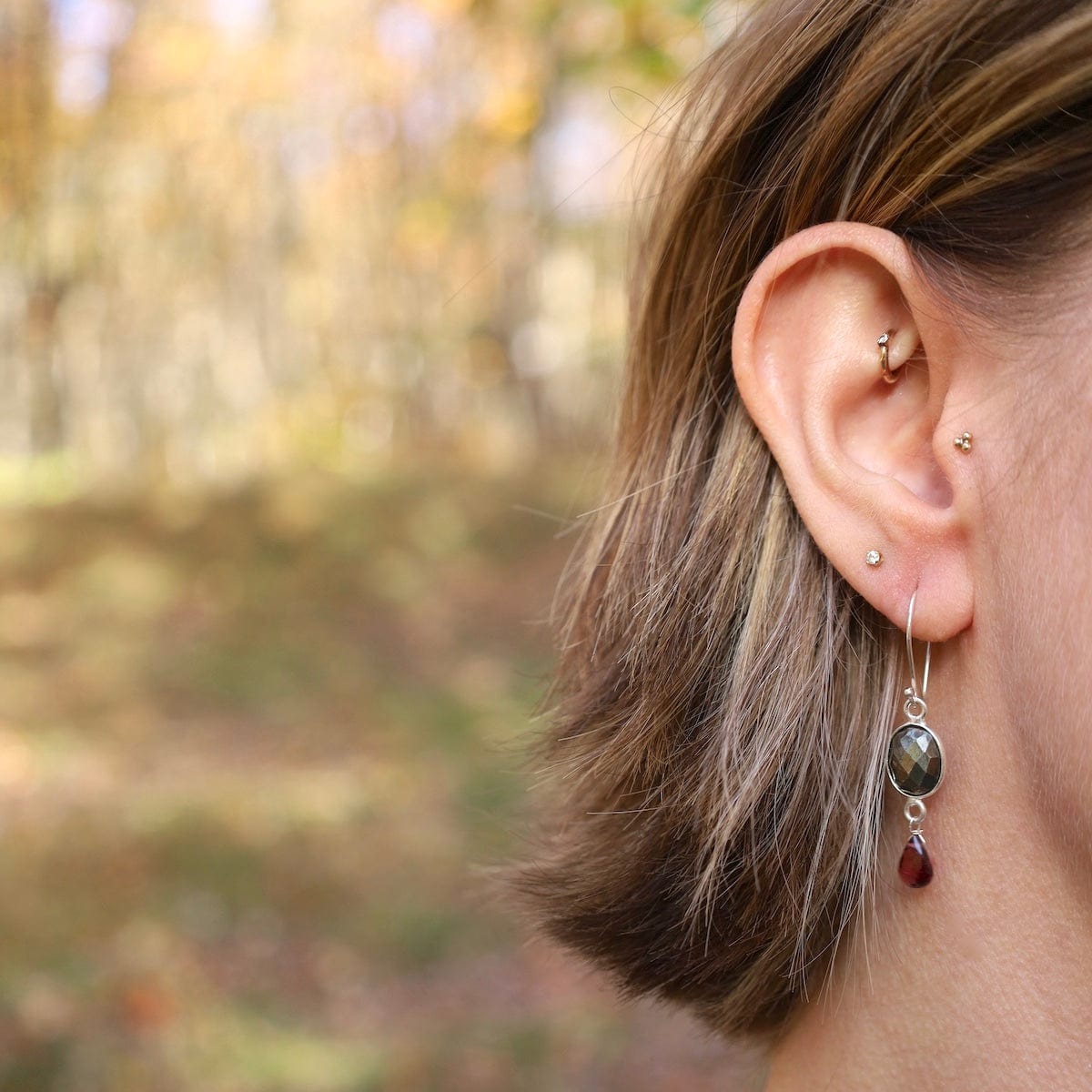 A timeless pairing of earthy shimmer and bold elegance, these handcrafted earrings feature faceted oval pyrite framed in sterling silver, finished with deep red garnet drops. The balance of metallic glow and rich gemstone color makes them perfect for day-to-night styling.