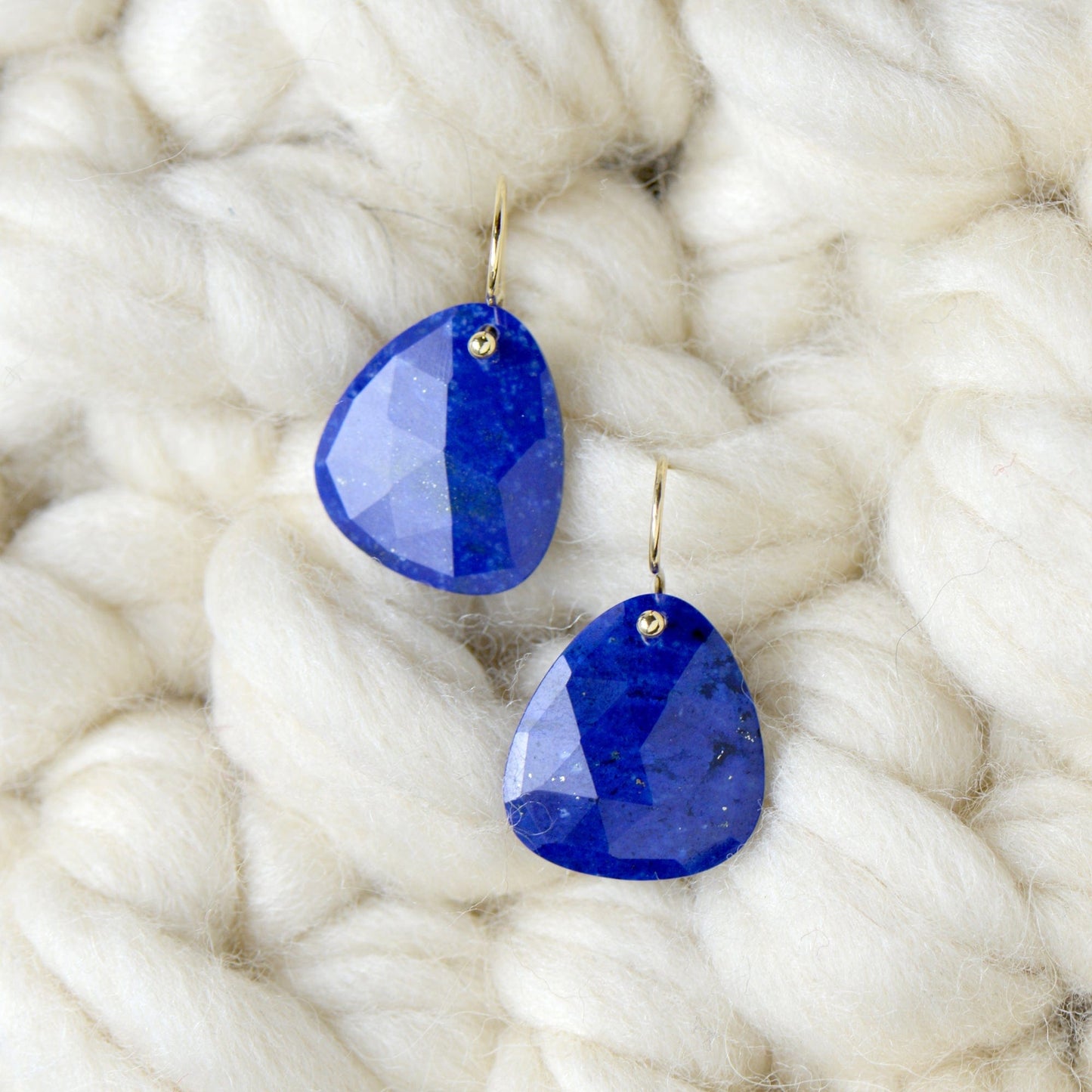 Delicate 18K yellow gold meets the mesmerizing blue of lapis lazuli in these charming drop earrings. The lapis stone catches the light beautifully, adding a touch of elegance to any look. These versatile earrings transition effortlessly from everyday wear to special occasions, bringing a pop of color and sophistication to your collection.