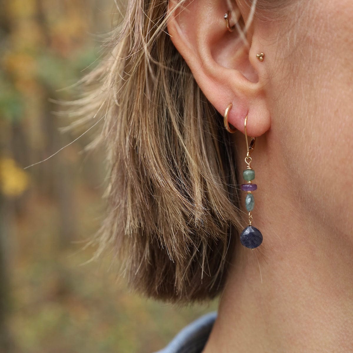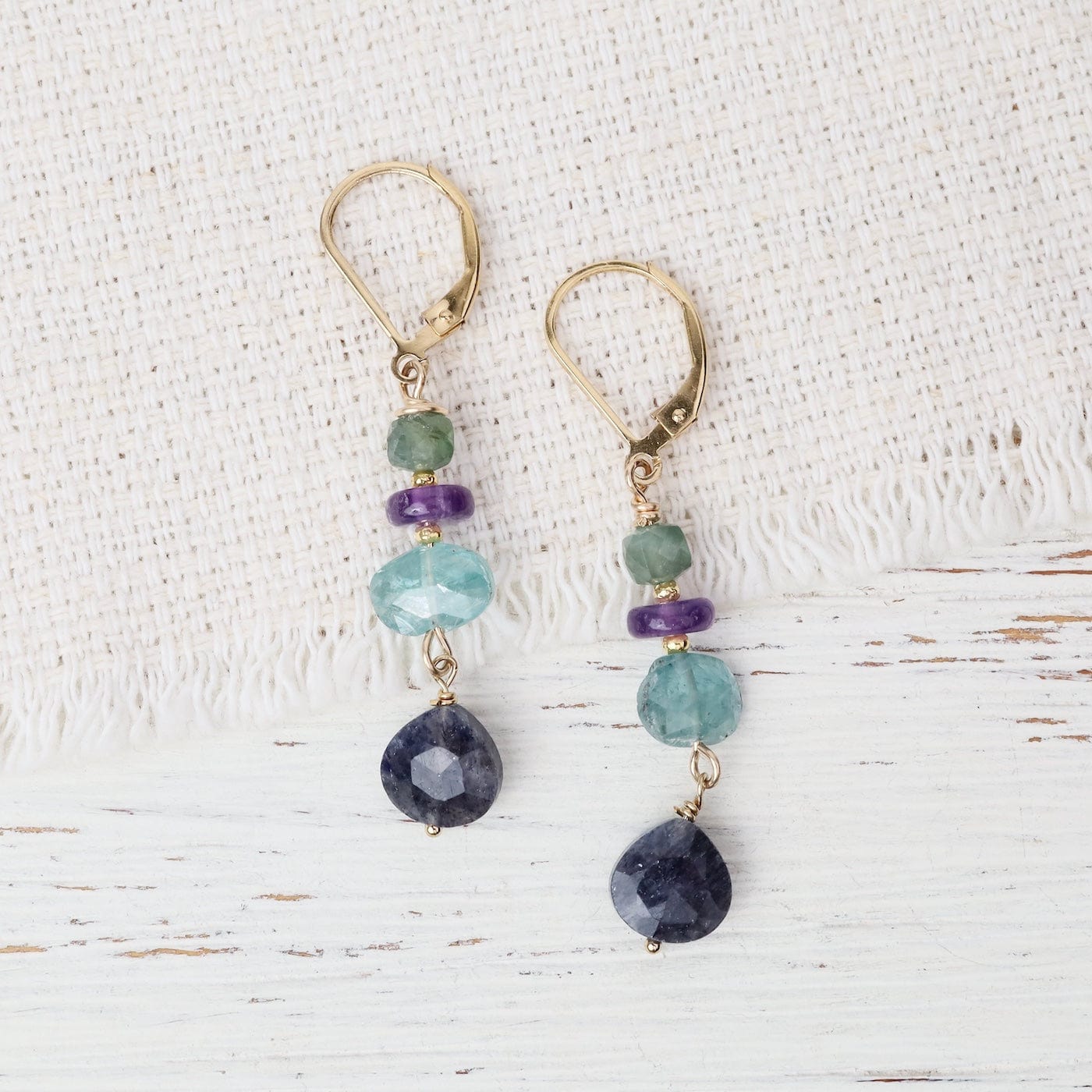A serene cascade of oceanic and twilight hues, these handcrafted earrings pair faceted gemstones in a harmonious gradient of color. From top to bottom — apatite, amethyst, aquamarine, and kyanite — each stone adds a distinct sparkle and depth. Perfect for adding a refined pop of color to any look.