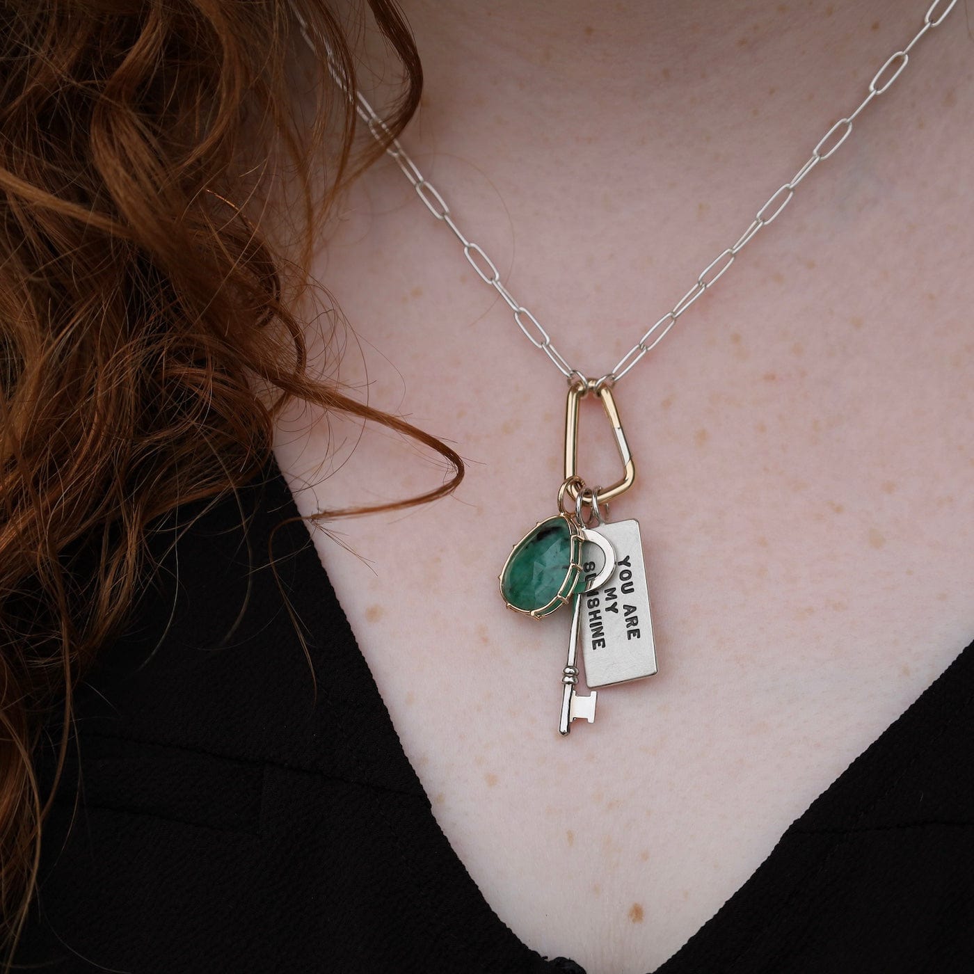 This one-of-a-kind charm showcases the natural beauty of an emerald, set in 14k yellow gold with delicate prongs that highlight its organic teardrop shape. The gemstone’s rich green hue and natural inclusions give it character and depth, making it a striking standalone piece or a meaningful addition to a layered charm collection. Measures 0.9" in total length and 0.5" wide.
