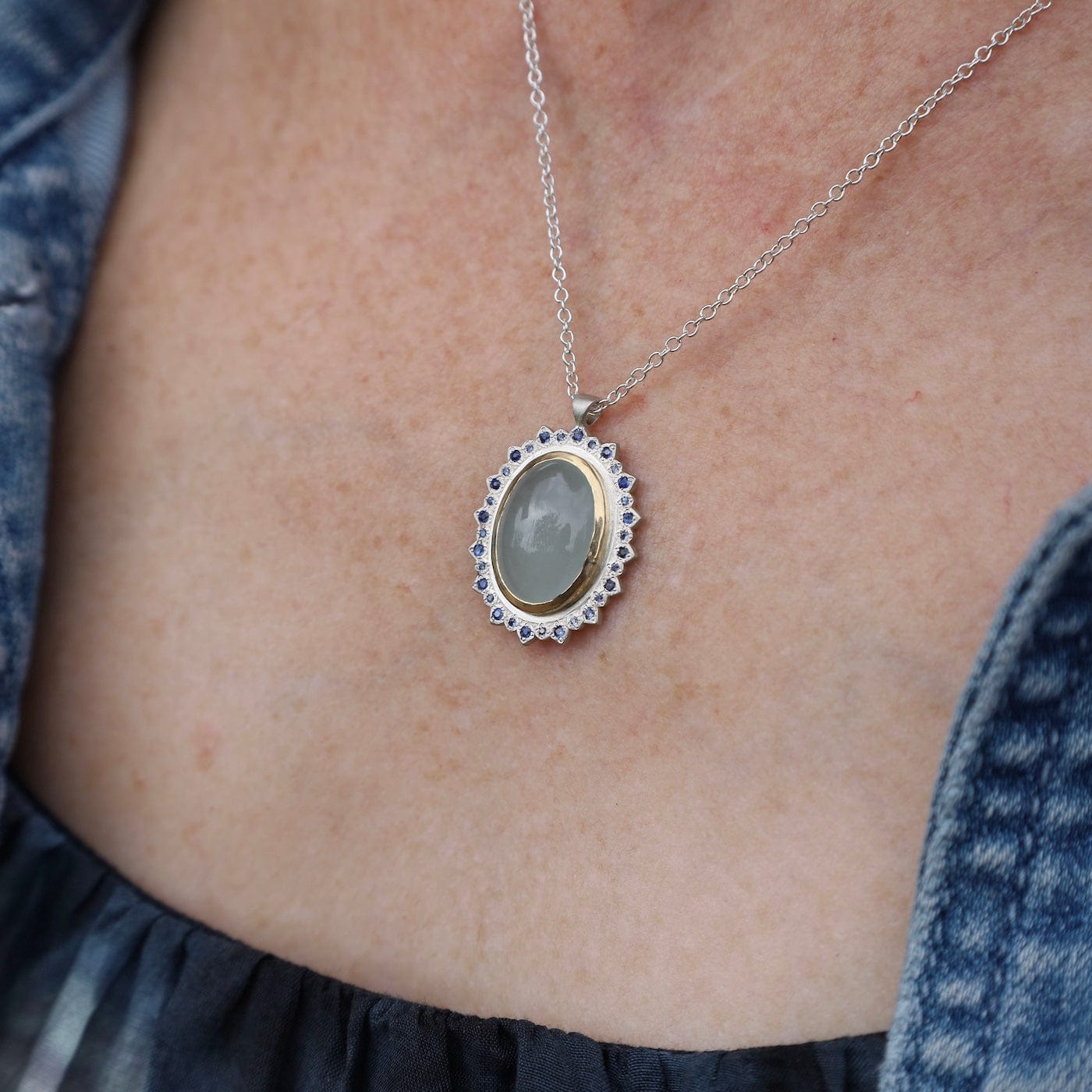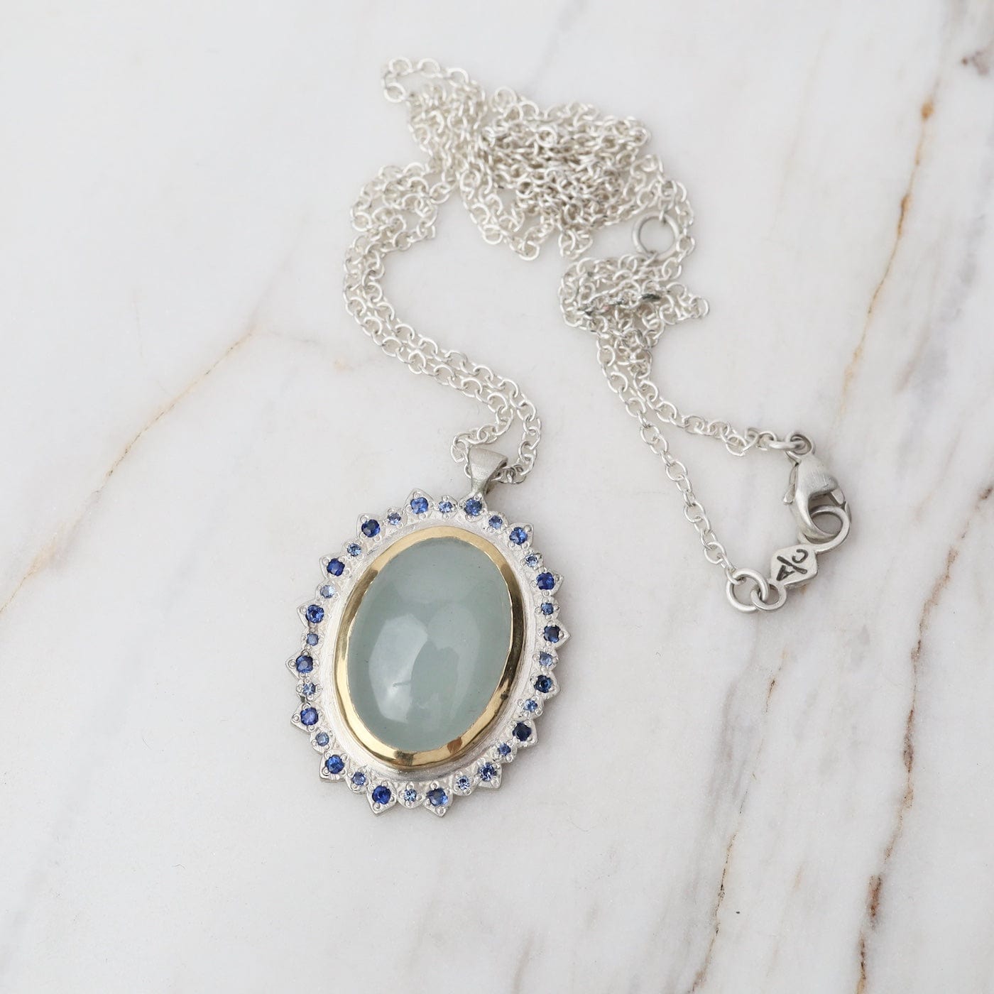 This one-of-a-kind handmade necklace features a dreamy smooth oval aquamarine, wrapped in a warm 18k yellow gold bezel and sprinkled with sparkly sapphires for just the right touch of shimmer. Set in sterling silver and finished with a sleek silver chain, it’s equal parts playful and polished — like a seaside treasure you’ll never want to take off.