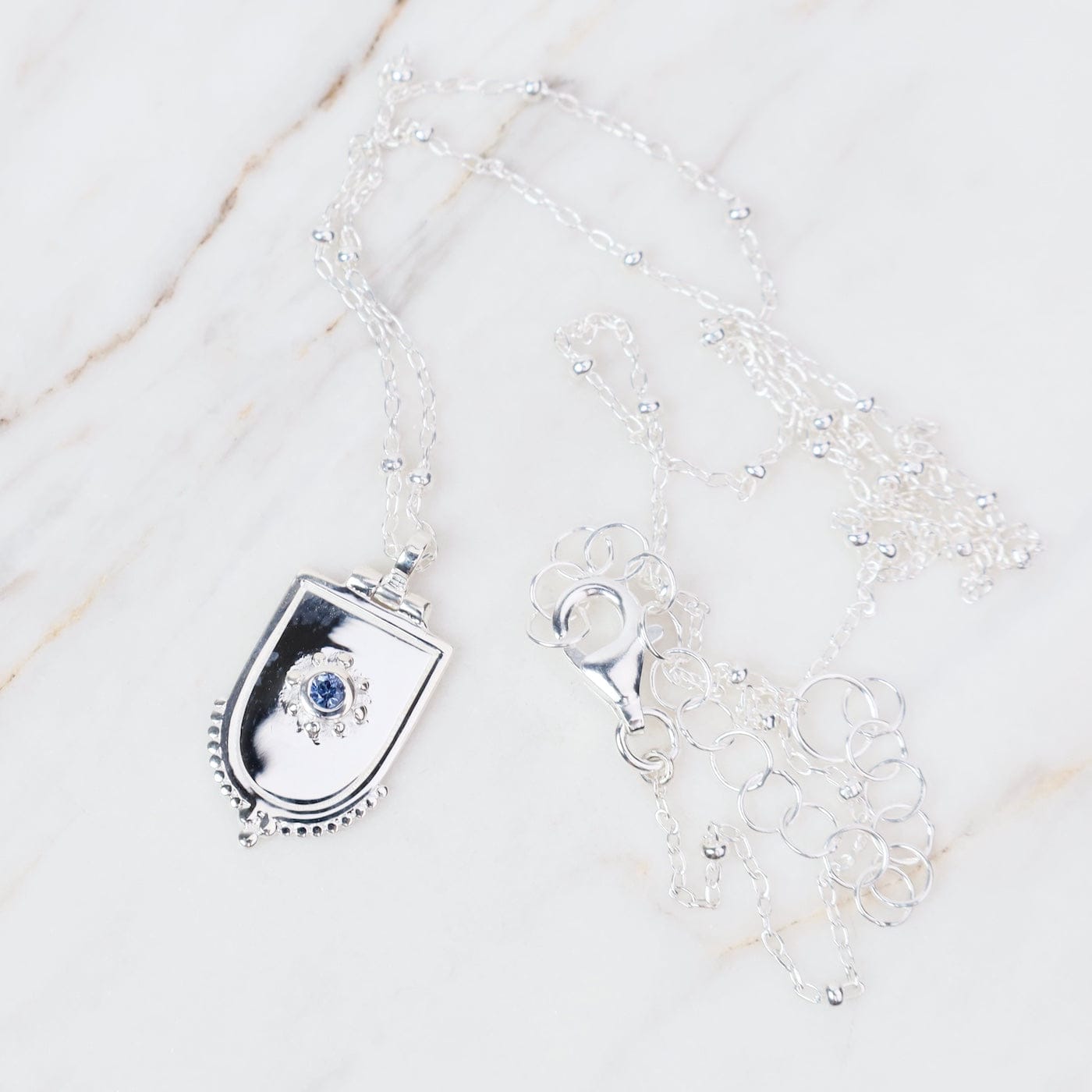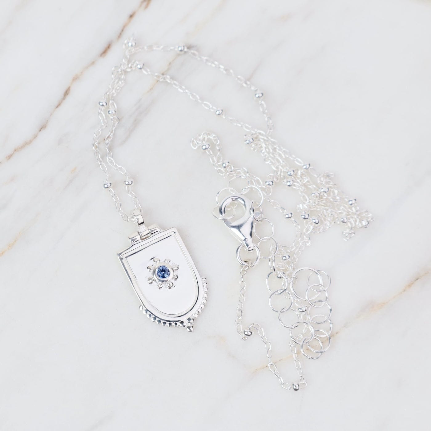 Sterling Silver Dotted Shield Necklace With Blue Sapphire