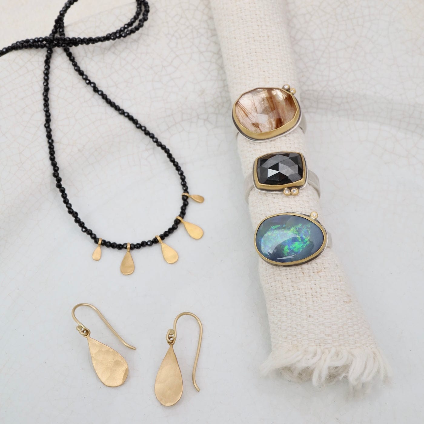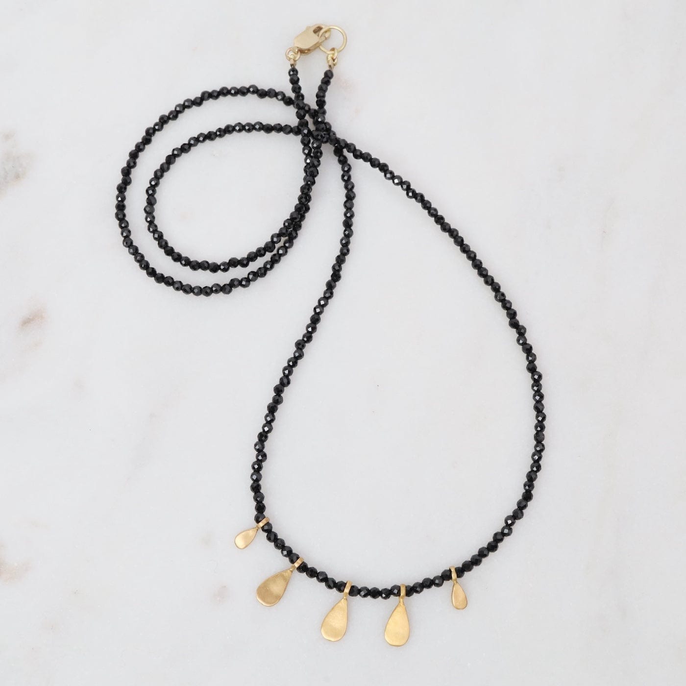 Five warm hammered 22k gold teardrops shimmer on a delicate strand of tiny, faceted black spinel beads. Lovely to layer with other necklaces, or wear on it's own!