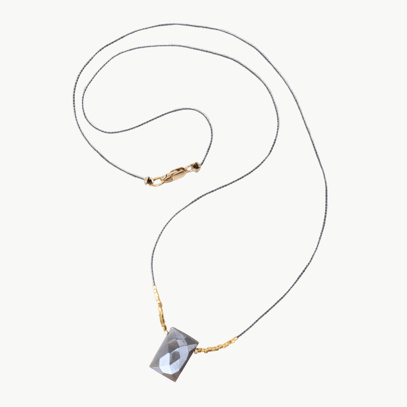 A striking dark mystic moonstone takes center stage—its faceted surface catching the light with every movement. Clear seed beads and warm gold-vermeil accents create a soft, elegant contrast, making this an effortless everyday piece with a touch of drama.