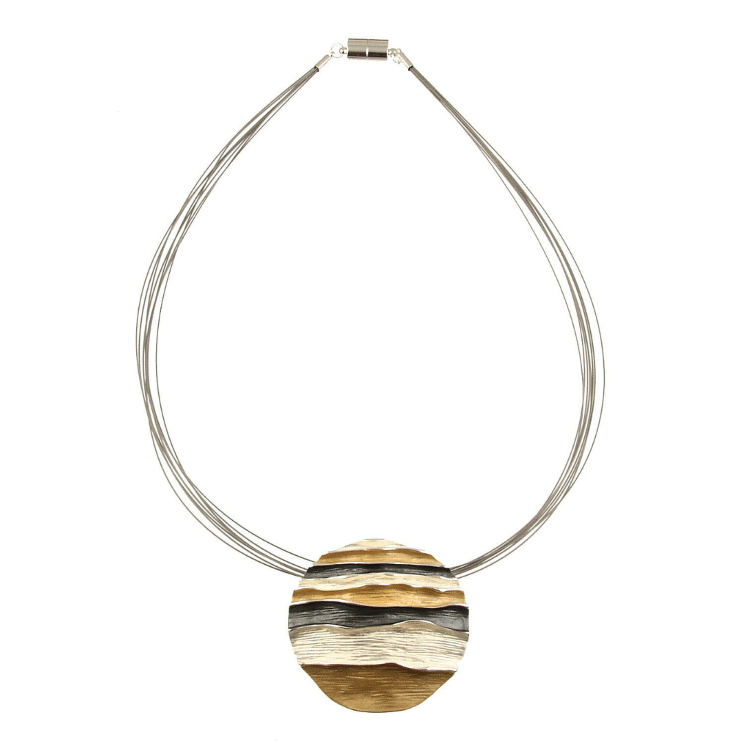 Inspired by the fluid beauty of the sea, this round pendant necklace showcases a rippling wave design in shimmering layers of gold, silver, and black. The bold circular pendant is paired with a sleek multi-strand silver-tone wire collar, finished with a secure magnetic clasp for ease and elegance.