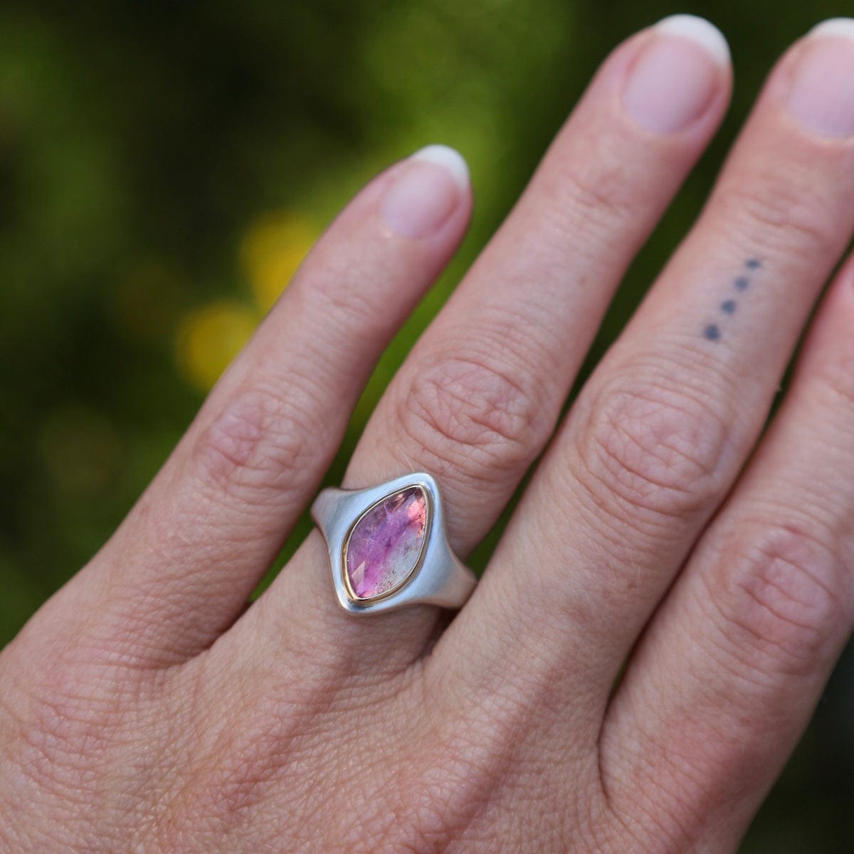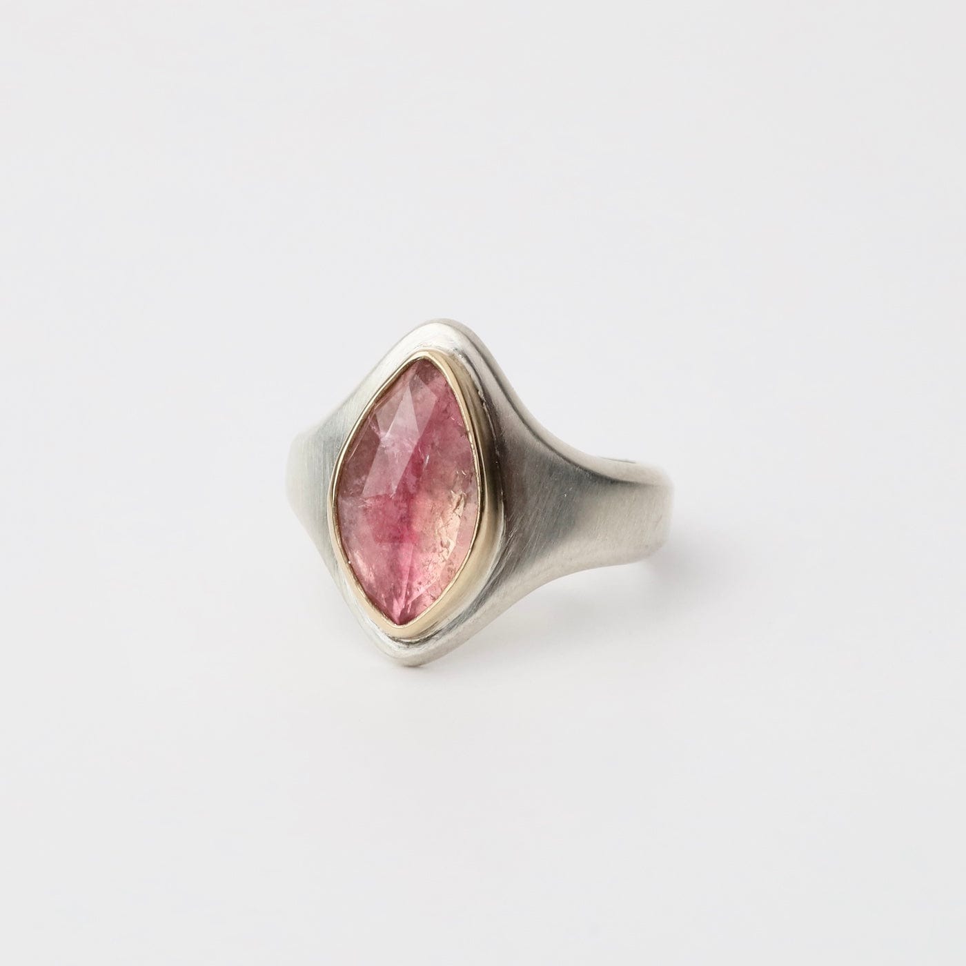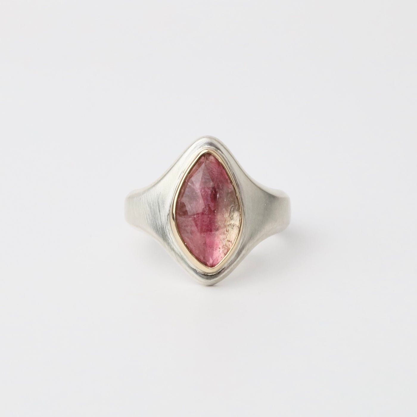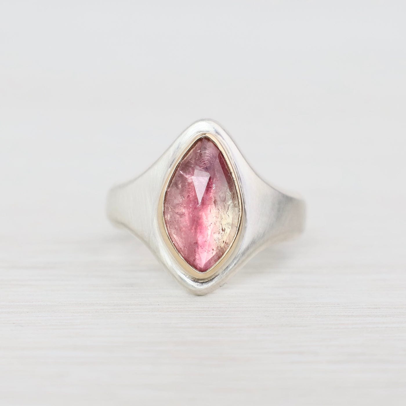 The Arroyo Ring captures natural beauty in a bold, sculptural design. At its heart sits a rose-cut bi-color tourmaline, shifting from soft blush to deep rose tones, set in a 14k yellow gold bezel. The wide sterling silver band tapers gracefully for comfort, while the elongated marquise-shaped face draws the eye with modern elegance. One of a kind and designed for everyday statement wear.