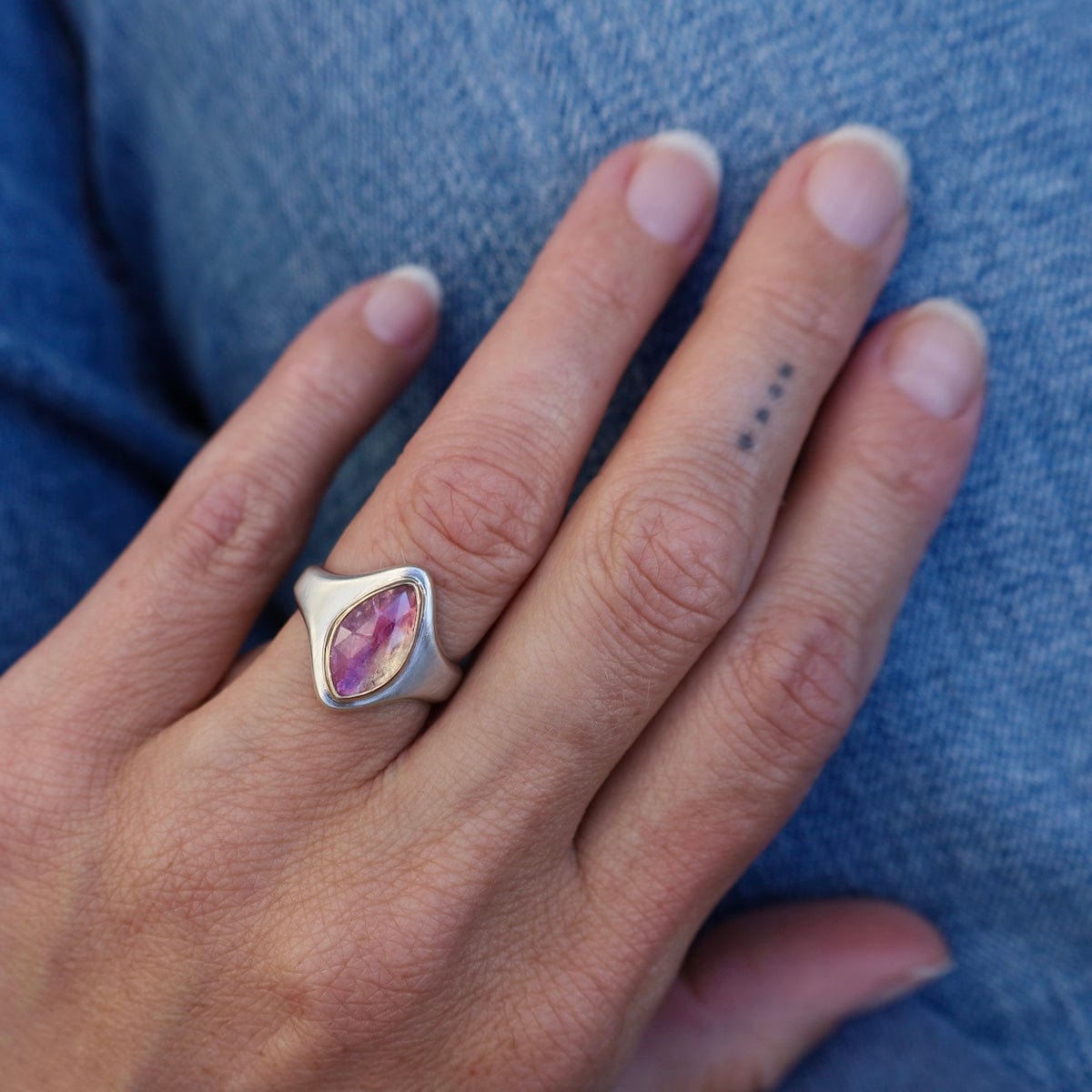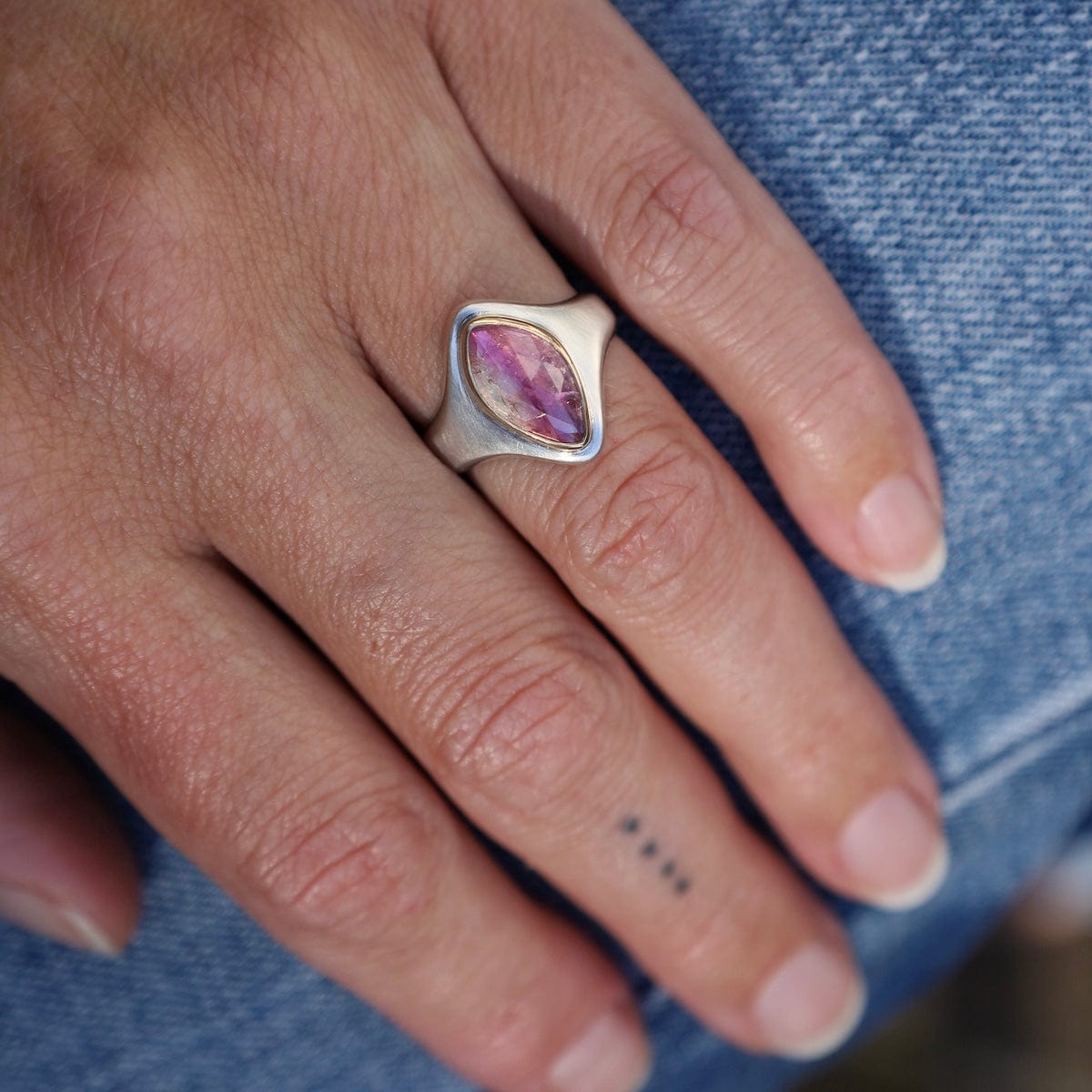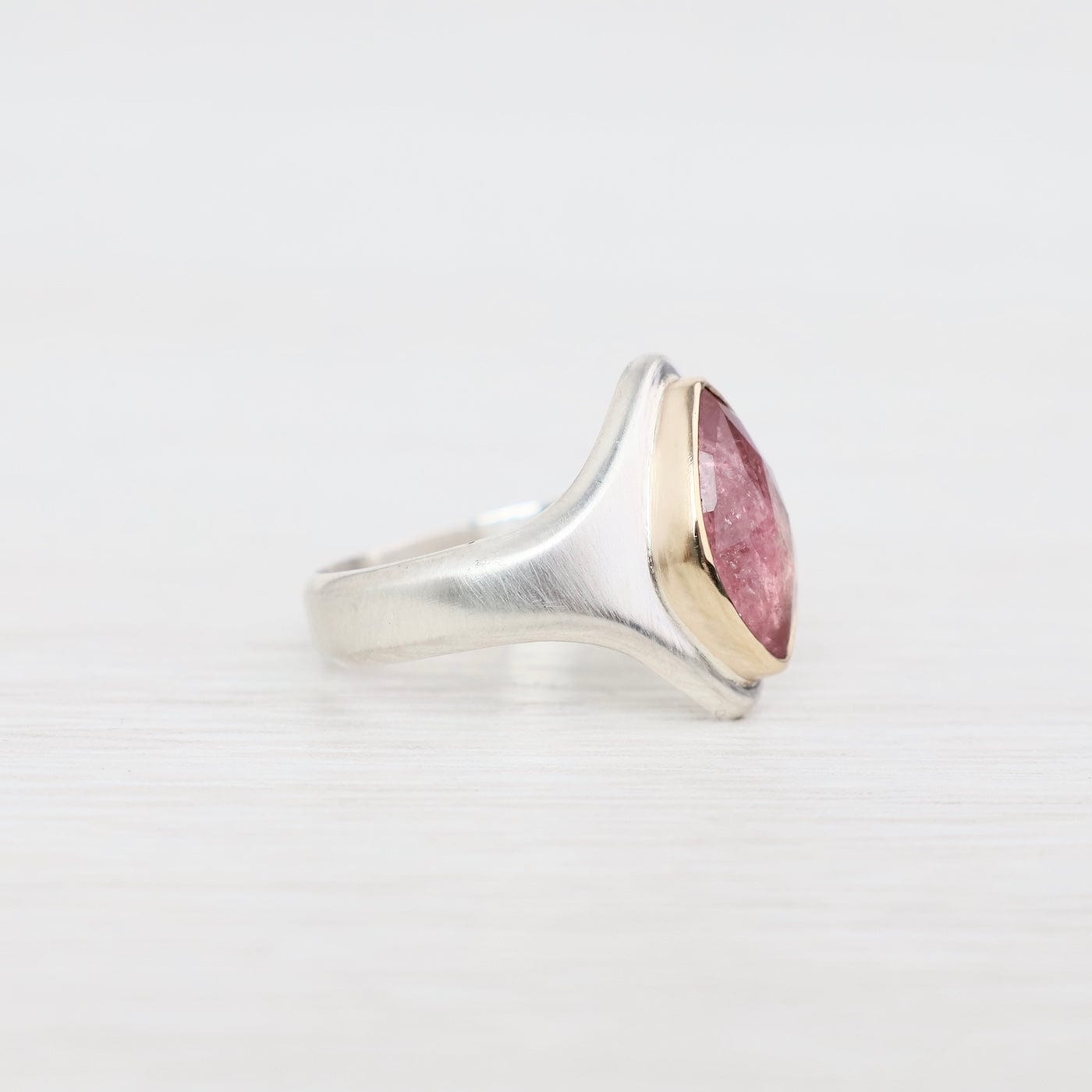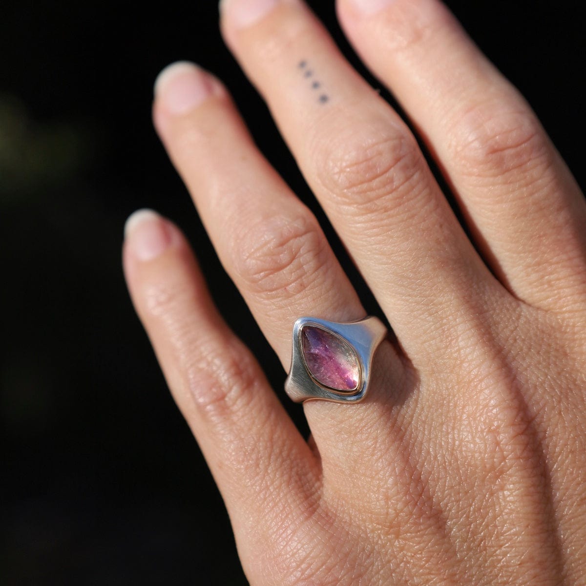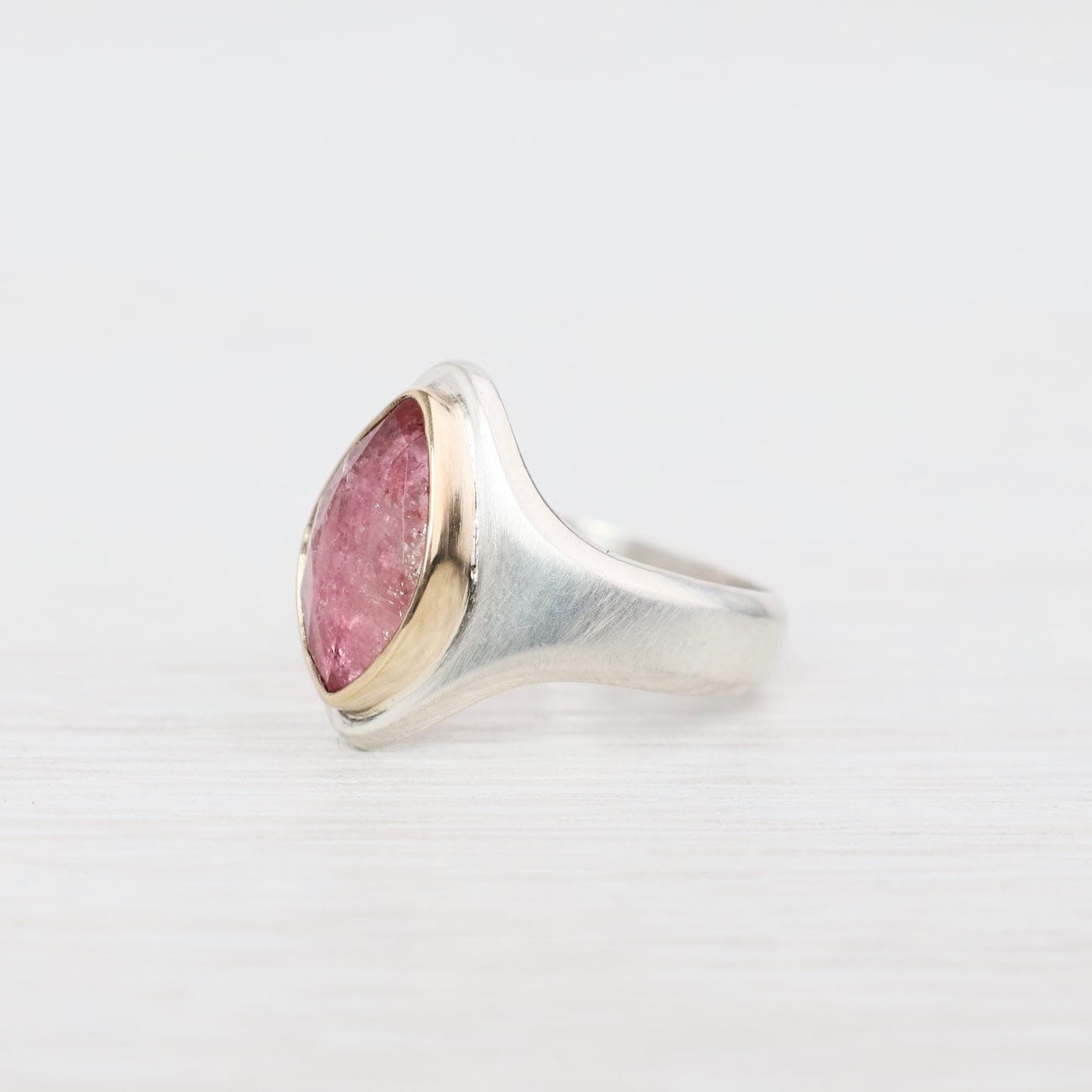 The Arroyo Ring captures natural beauty in a bold, sculptural design. At its heart sits a rose-cut bi-color tourmaline, shifting from soft blush to deep rose tones, set in a 14k yellow gold bezel. The wide sterling silver band tapers gracefully for comfort, while the elongated marquise-shaped face draws the eye with modern elegance. One of a kind and designed for everyday statement wear.