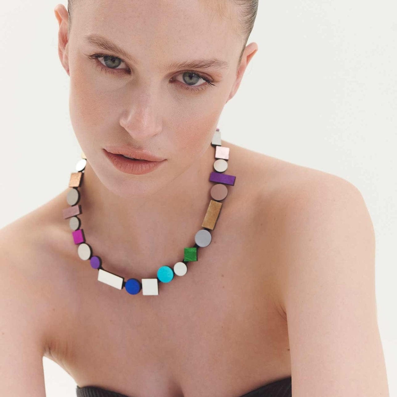 Playful yet polished, this contemporary necklace pairs soft leather with glossy acrylic shapes in a striking mix of circles, squares, and rectangles. The vibrant palette adds a joyful pop of color, while the clean geometric lines keep it modern and artful. Lightweight and comfortable, it sits beautifully along the neckline and fastens effortlessly with a secure magnetic closure.