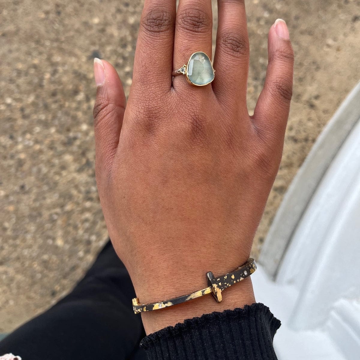 Cool, calm, and radiant—this mixed metal ring features a luminous aquamarine set in a 14k yellow gold bezel, accented with sparkling blue zircons and delicate gold beads. Finished with Emily’s signature sterling silver band, it’s a serene statement piece perfect for everyday elegance.