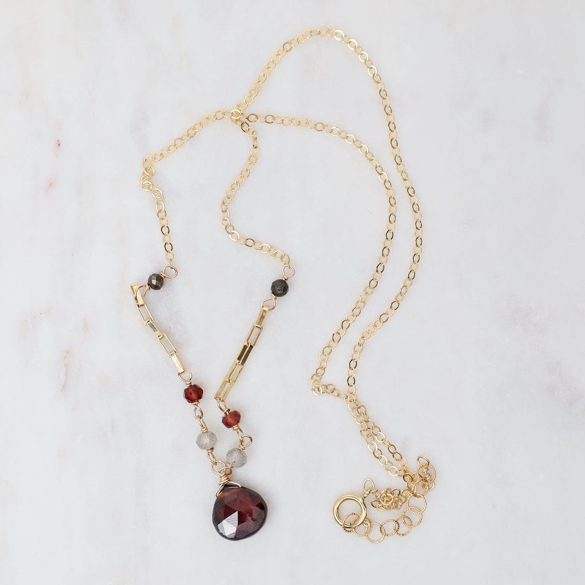 Elevate your necklace game with this elegant design featuring a deep garnet drop accented by shimmering details that catch the light with every move. The texture and dimension make this piece feel both refined and playfully luxe. Wear it close to your heart or layer it with your favorites for extra sparkle.