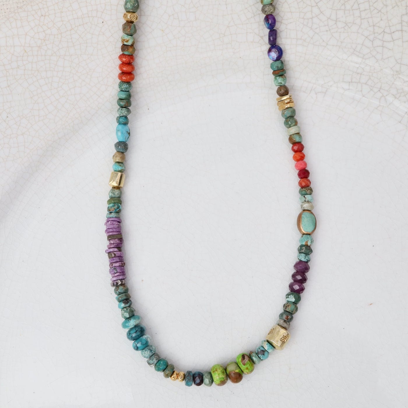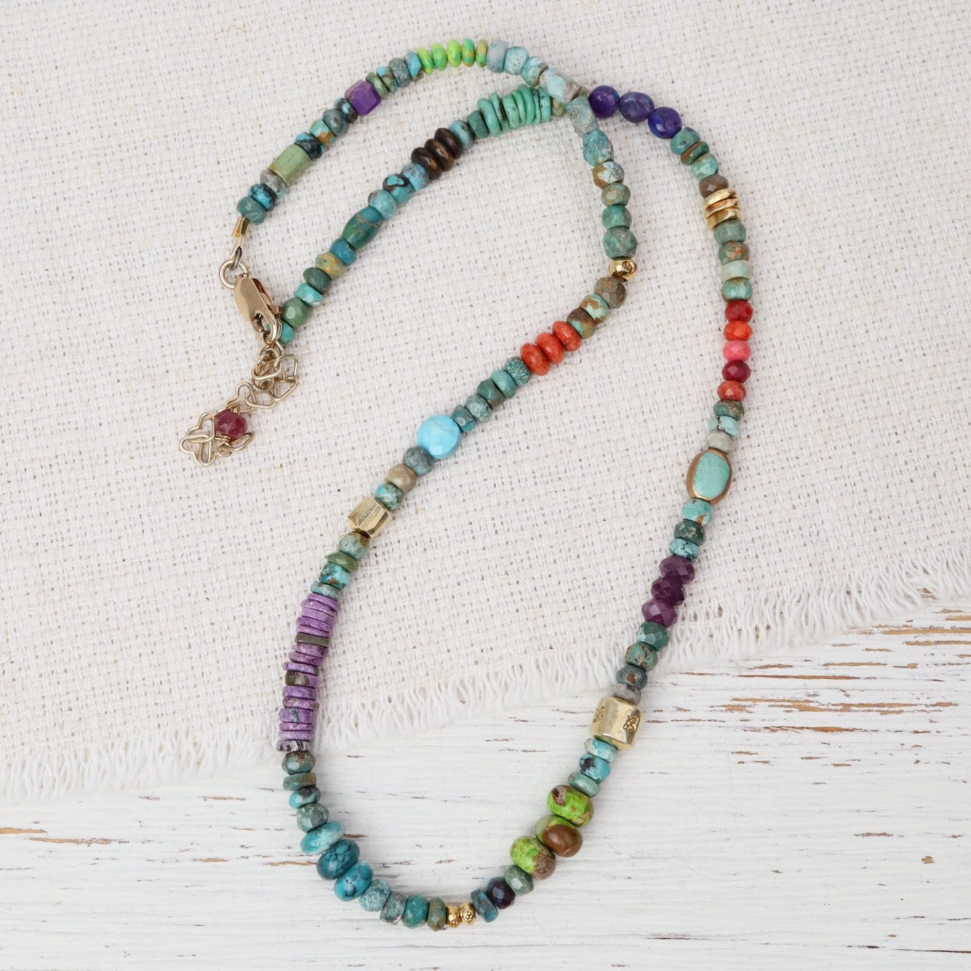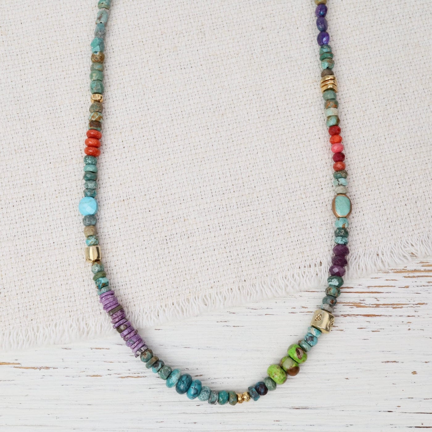 Handmade in the United States, this vibrant necklace bursts with color and texture—an effortless statement piece for everyday wear. Featuring turquoise, phosphosiderite, coral, ruby, charoite from Siberia, purple sapphire, and purple turquoise from the Mohave Desert, each bead tells its own story. Finished with Thai silver plated in 22k gold for a touch of warmth and elegance.