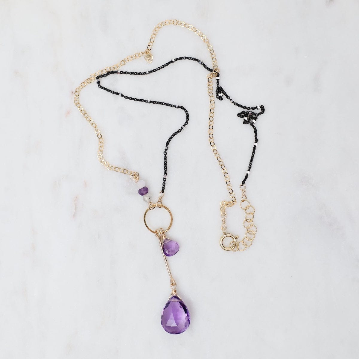 Ditch the symmetry and embrace the magic of this asymmetrical necklace featuring a gorgeous amethyst stone suspended from mixed gold-filled and gunmetal chains. The two-tone metals create an intriguing contrast that frames the purple gem perfectly, while the off-balance design keeps things fresh and fun. Your new go-to for adding unexpected sparkle to any outfit.
