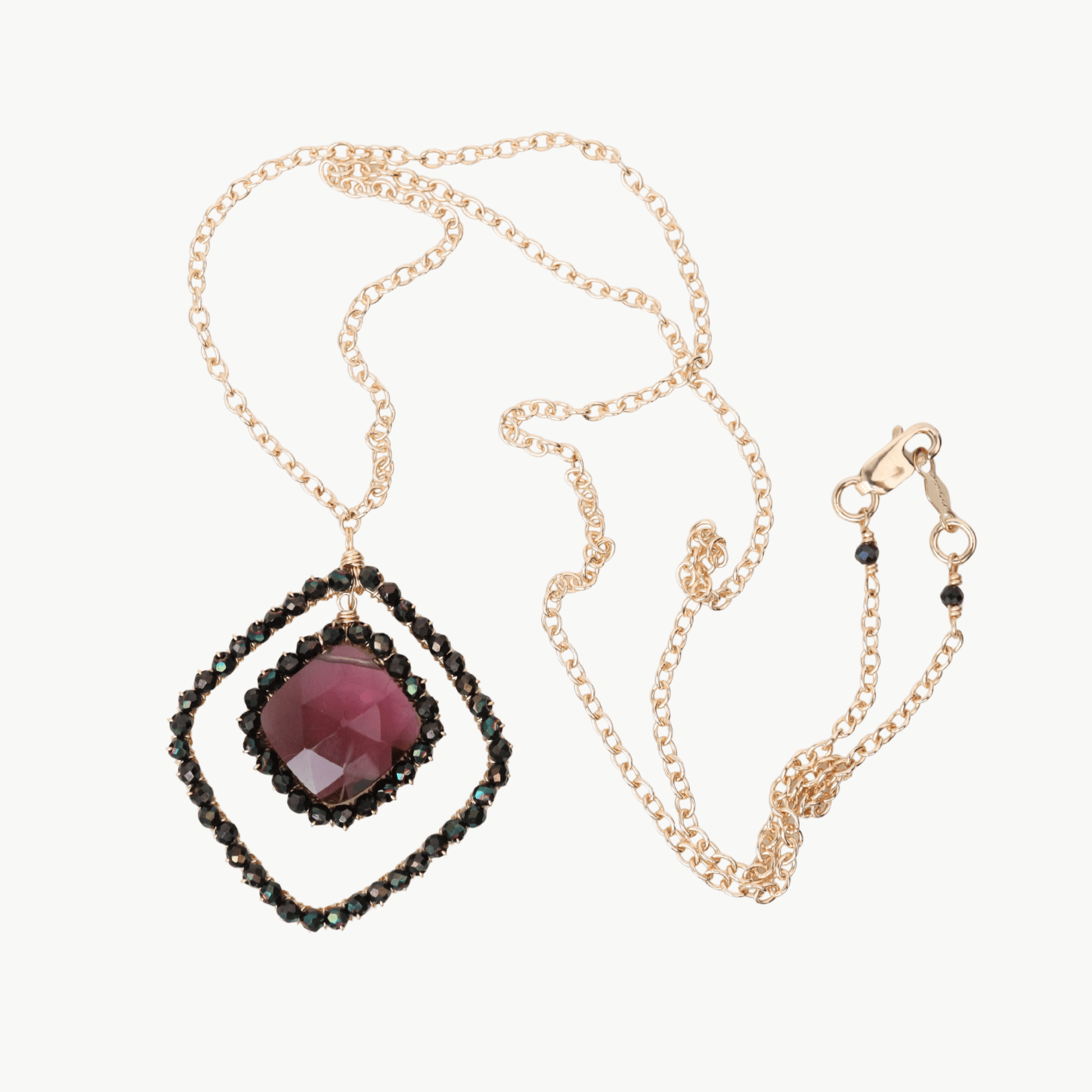 A rich pop of deep wine color takes center stage in this elegant pendant necklace. Faceted amethyst quartz is wrapped in a double frame of shimmering jet crystals, creating a striking contrast that catches the light beautifully. Suspended from a gold-filled medium cable chain, it’s a refined piece that transitions effortlessly from day to evening.