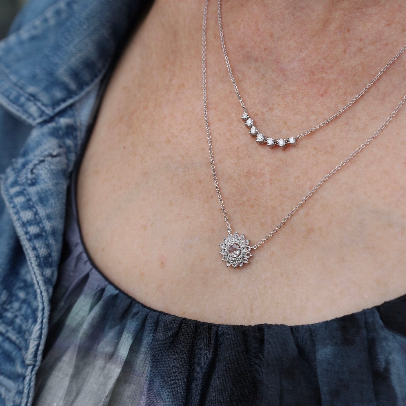 A refined classic with a modern touch, this necklace features seven sparkling white diamonds (0.33ct) set in a graceful graduated bar design. Crafted in 14k white gold, the diamonds are arranged for maximum brilliance and fluid movement, making this piece a versatile staple for layering or wearing solo. Suspended on an adjustable chain (16–18"), it’s the perfect everyday luxury.