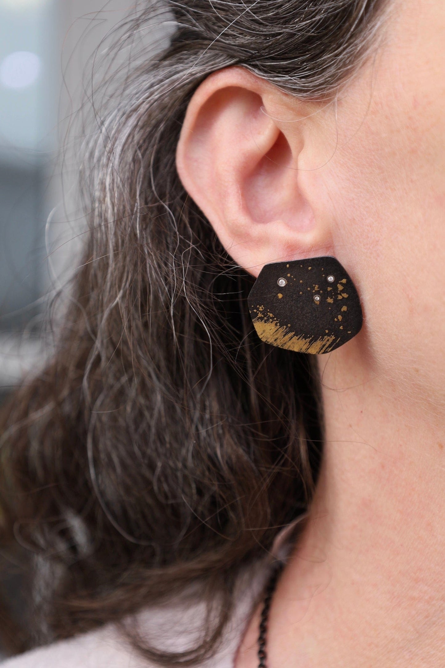 Bold yet refined, these handcrafted earrings are a striking statement of contrast and elegance. Forged from raw iron, the dark, textured surface is gracefully interrupted by delicate streaks of 18k gold dust and scattered white diamonds. Each earring is individually made, ensuring a one-of-a-kind piece that honors both craft and material.