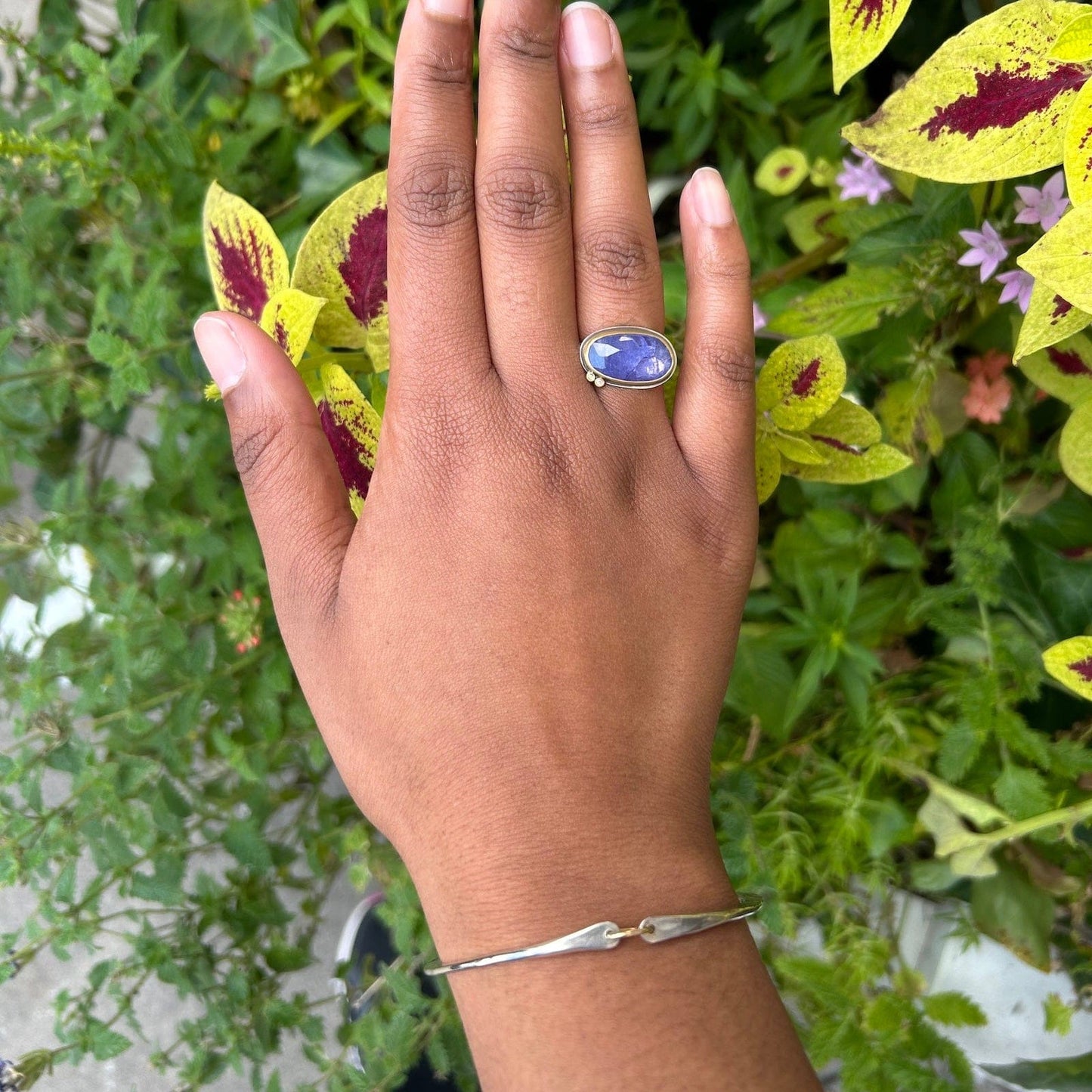 Bright blue-purple, rosecut tanzanite is set in 22k gold and accented with two 22k diamond dots.