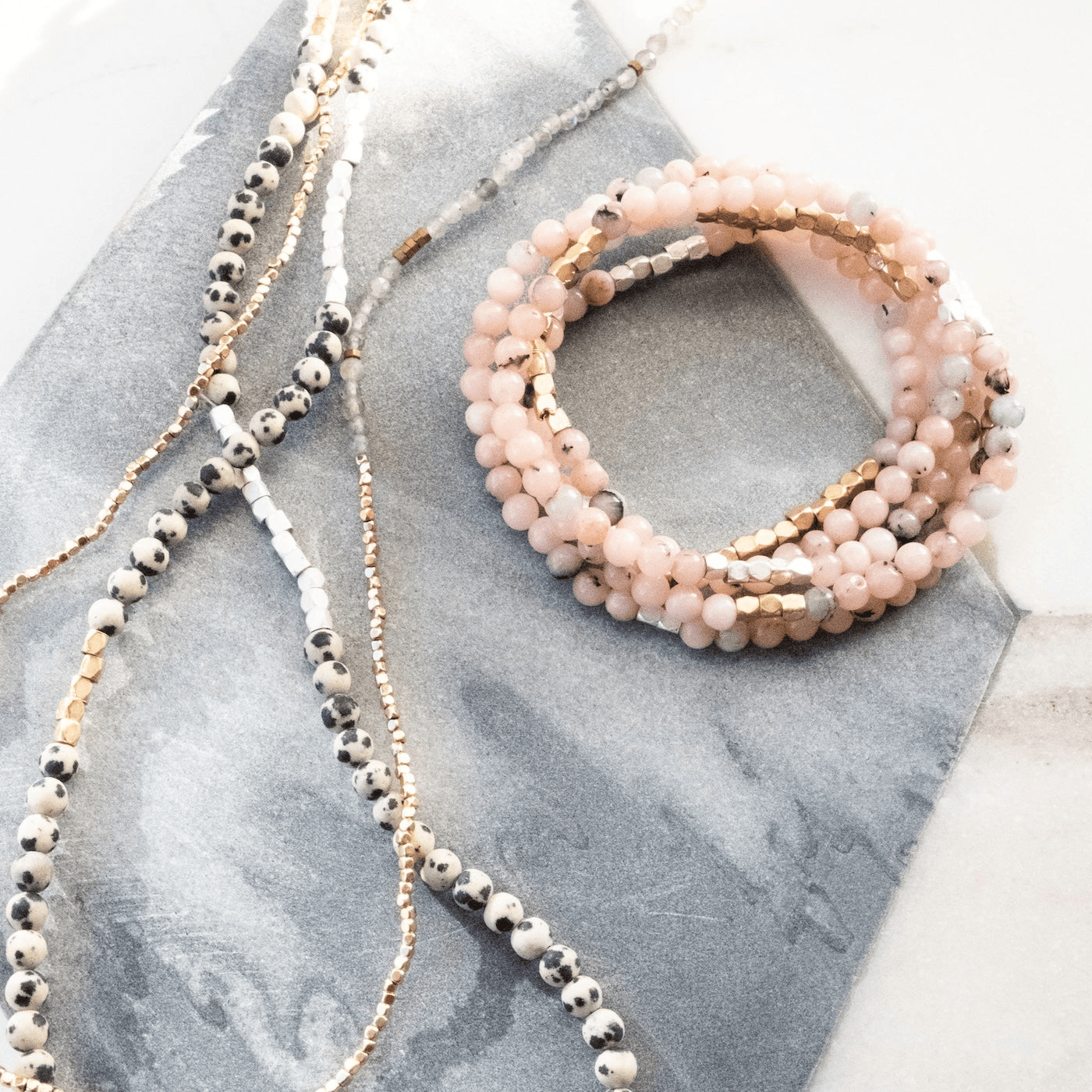Tap into the energies of the earth. Semi precious gemstones adorn wrist & neckline. Effortlessly converts from bracelet to necklace. Can be wrapped 4-5 times as a bracelet and 1-2 times as a necklace.