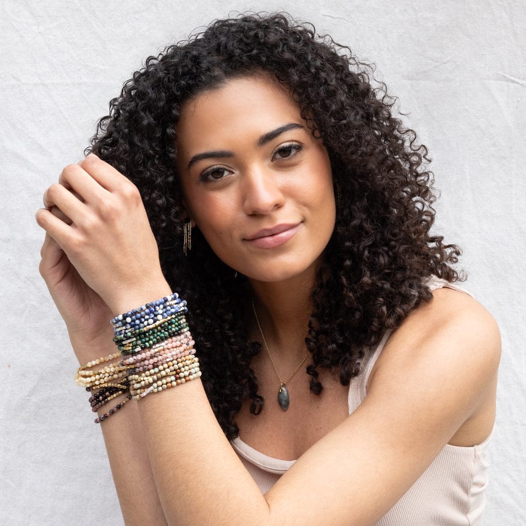 Tap into the energies of the earth. Semi precious gemstones adorn wrist & neckline. Effortlessly converts from bracelet to necklace.