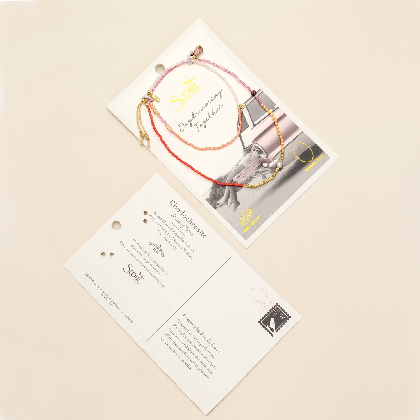 Hand strung with Japanese Miyuki Beads, organic pearls, and meaningful stones, each bracelet/necklace wrap comes packaged on a nostalgia-inspired postcard that celebrates life's journey & heartfelt connections.