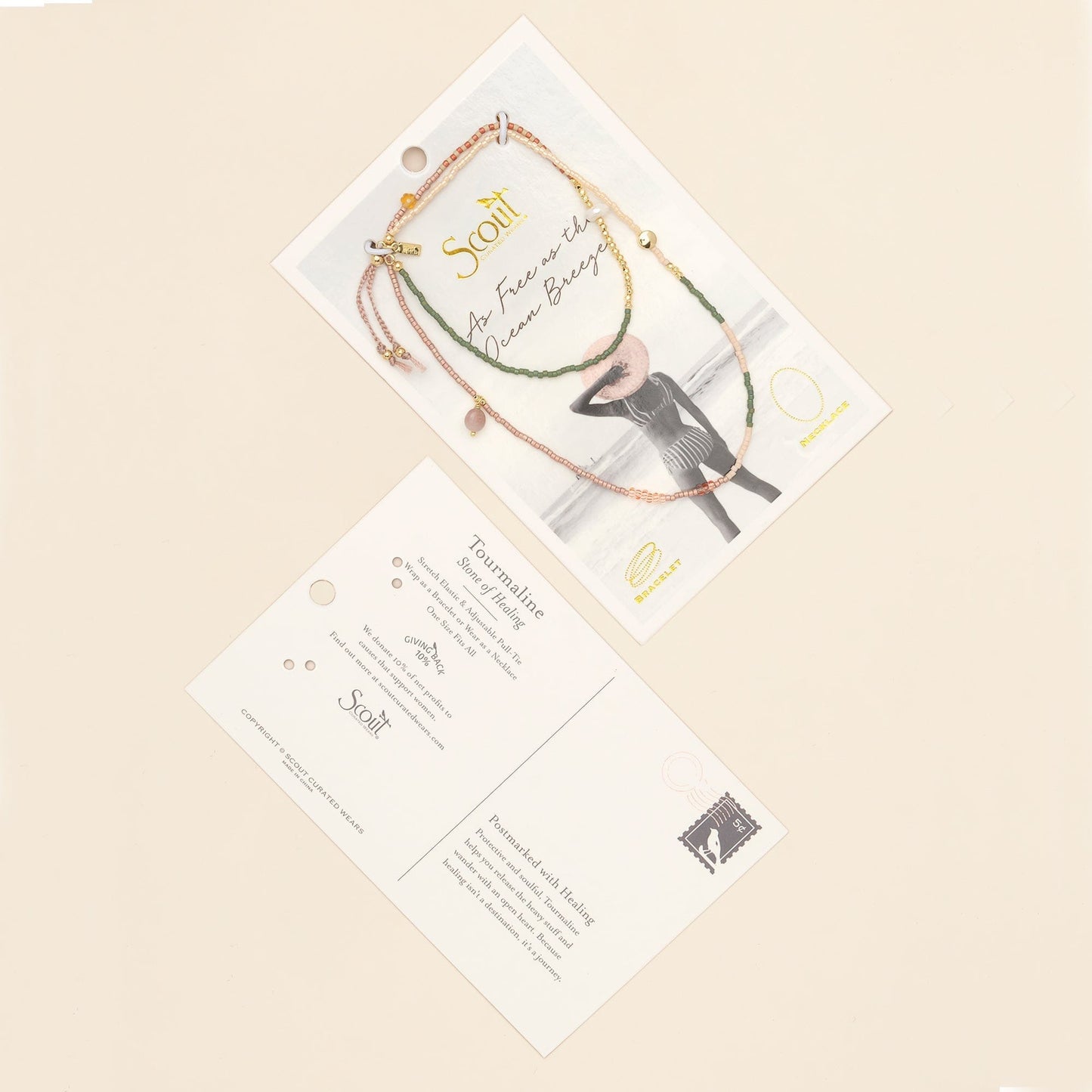 Hand strung with Japanese Miyuki Beads, organic pearls, and meaningful stones, each bracelet/necklace wrap comes packaged on a nostalgia-inspired postcard that celebrates life's journey & heartfelt connections.