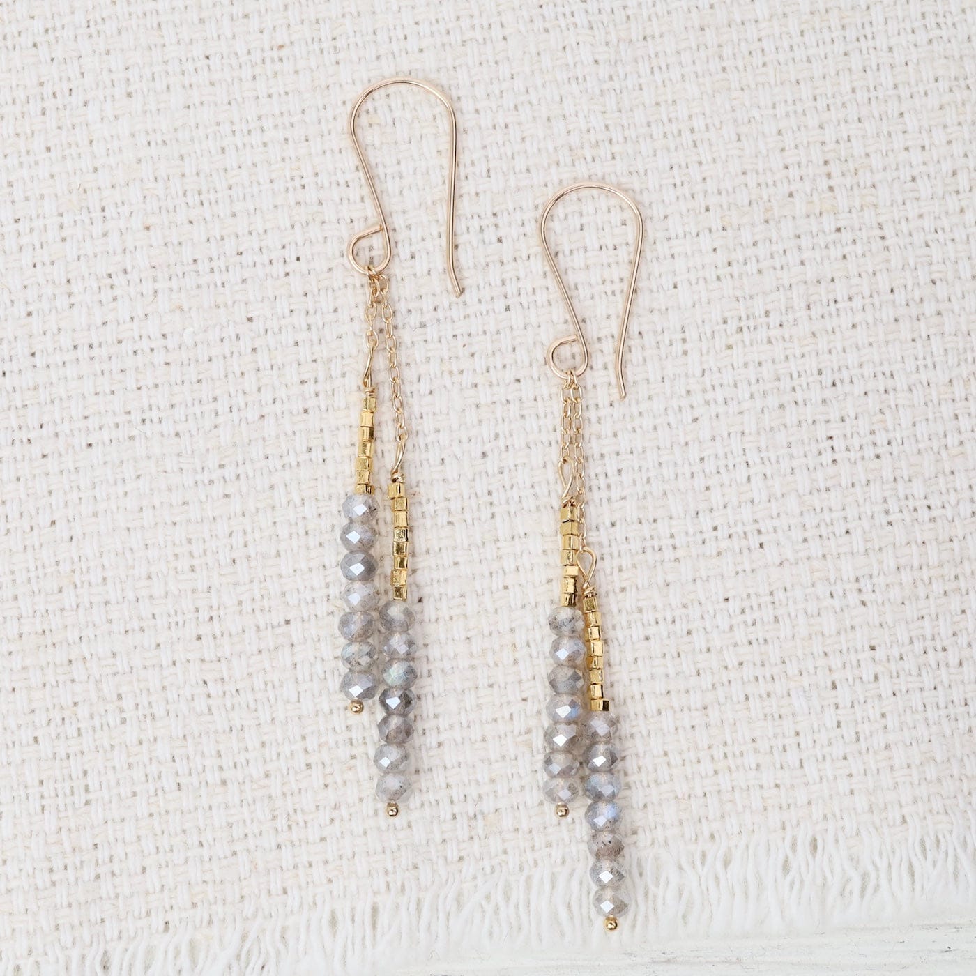 Shimmering mystic labradorite beads cascade in delicate twig-like strands, accented with warm gold vermeil for a touch of texture and shine. Suspended from gold-filled hook ear wires, these earrings offer graceful movement and an elegant, elongated silhouette.
