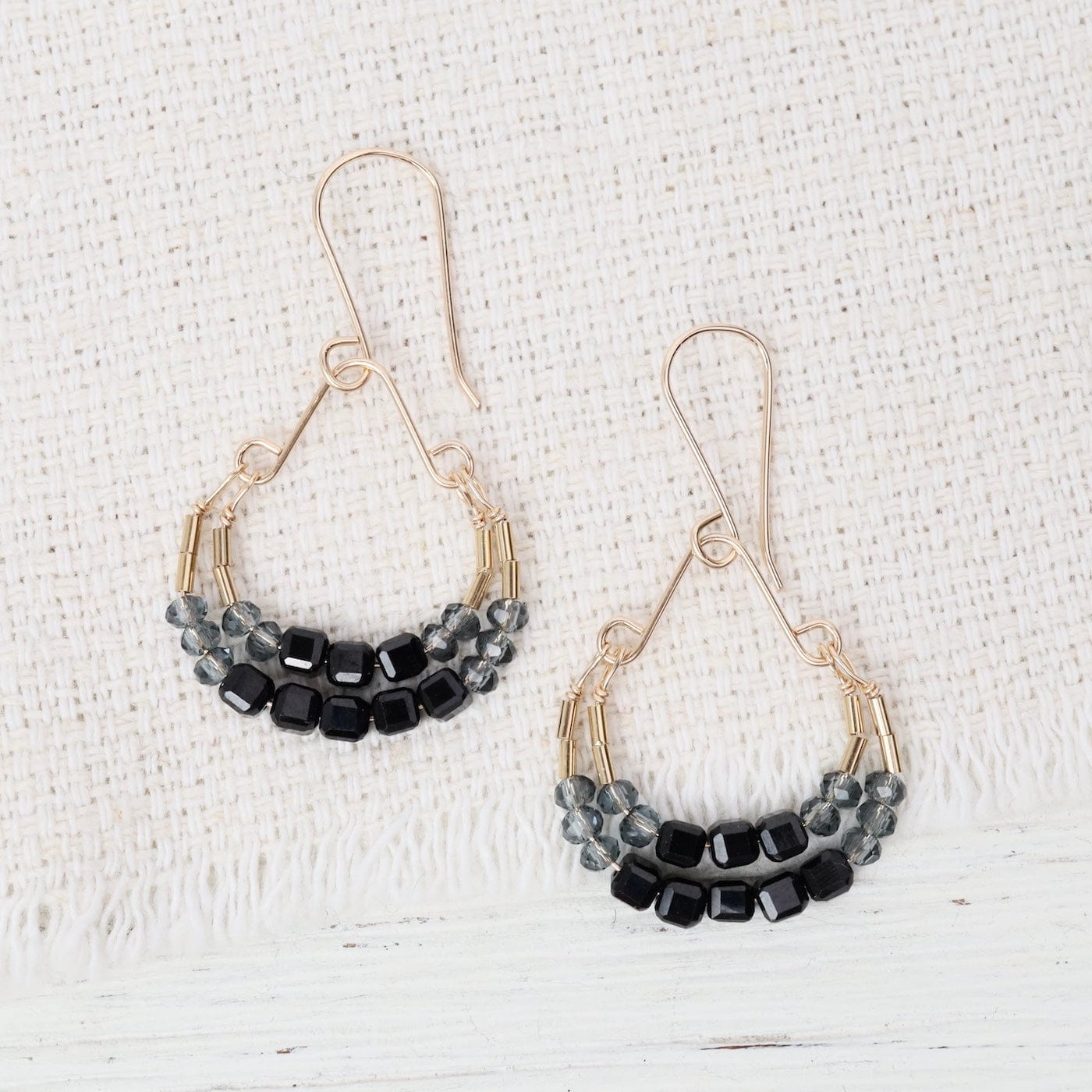 A modern, lightweight design with beautiful contrast. Faceted grey quartz and sleek black spinel beads arc gracefully along double gold-filled crescent wires, creating soft movement and subtle shimmer. Finished with gold-filled hook ear wires for effortless everyday wear.