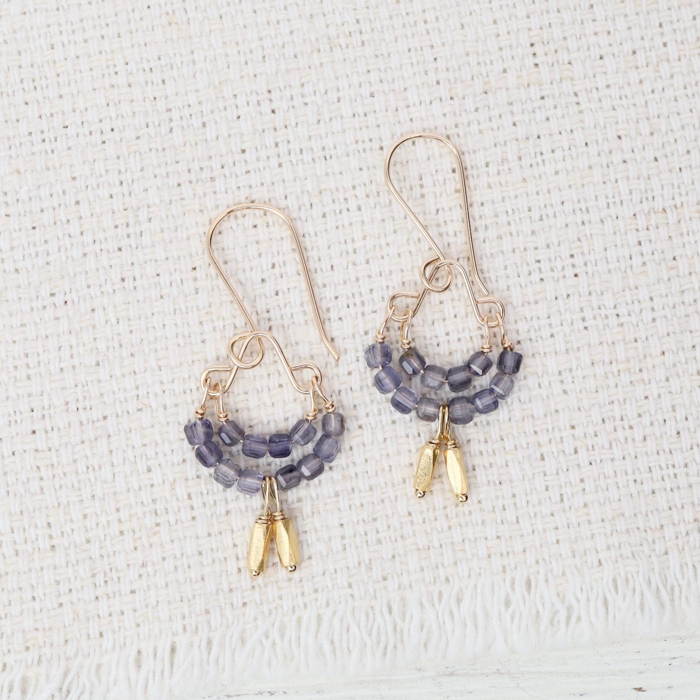 Soft indigo iolite beads form a graceful double-crescent silhouette, accented with polished gold vermeil drops for a touch of movement and shine. Lightweight and full of subtle color play, these earrings bring an artful, easy elegance to everyday style.