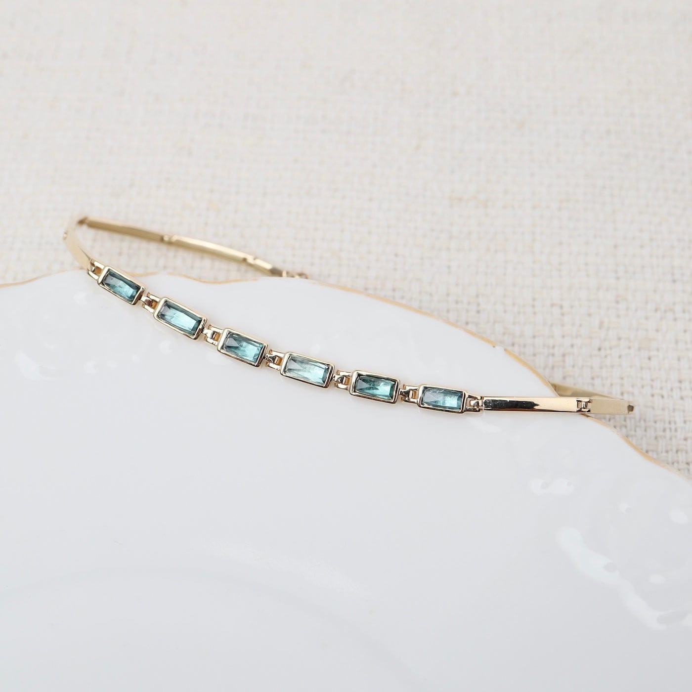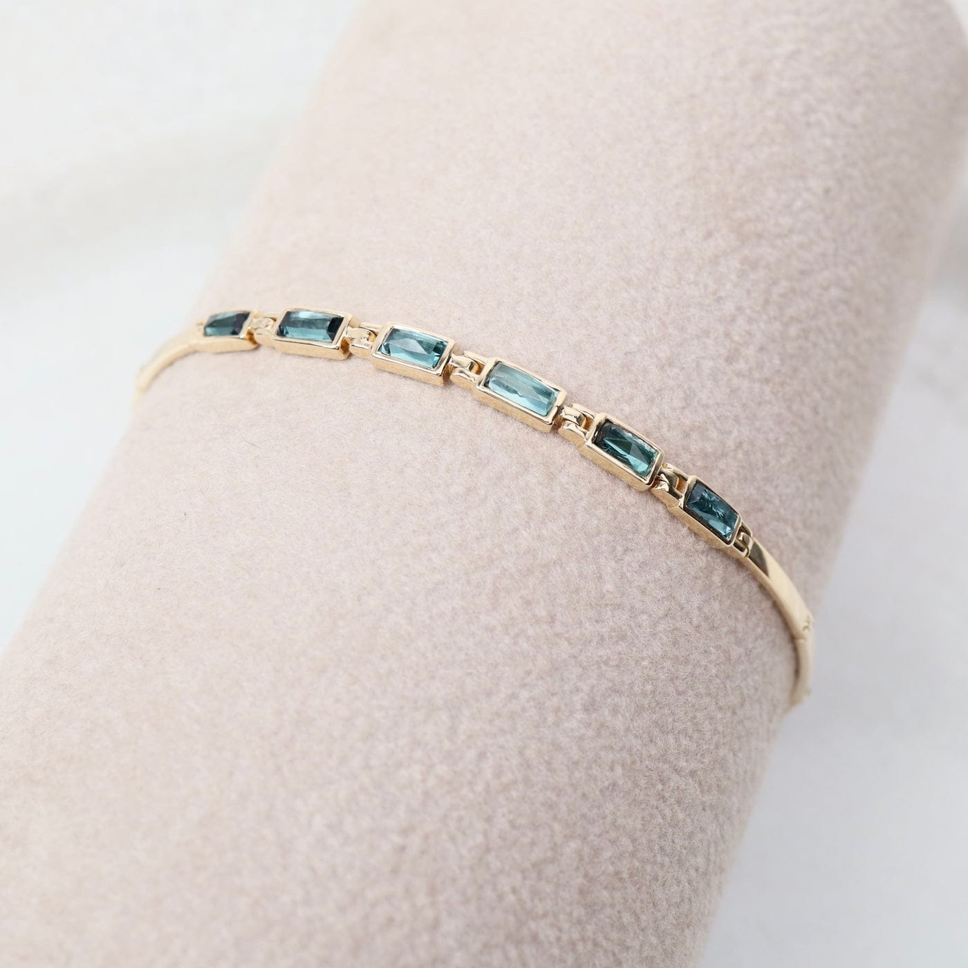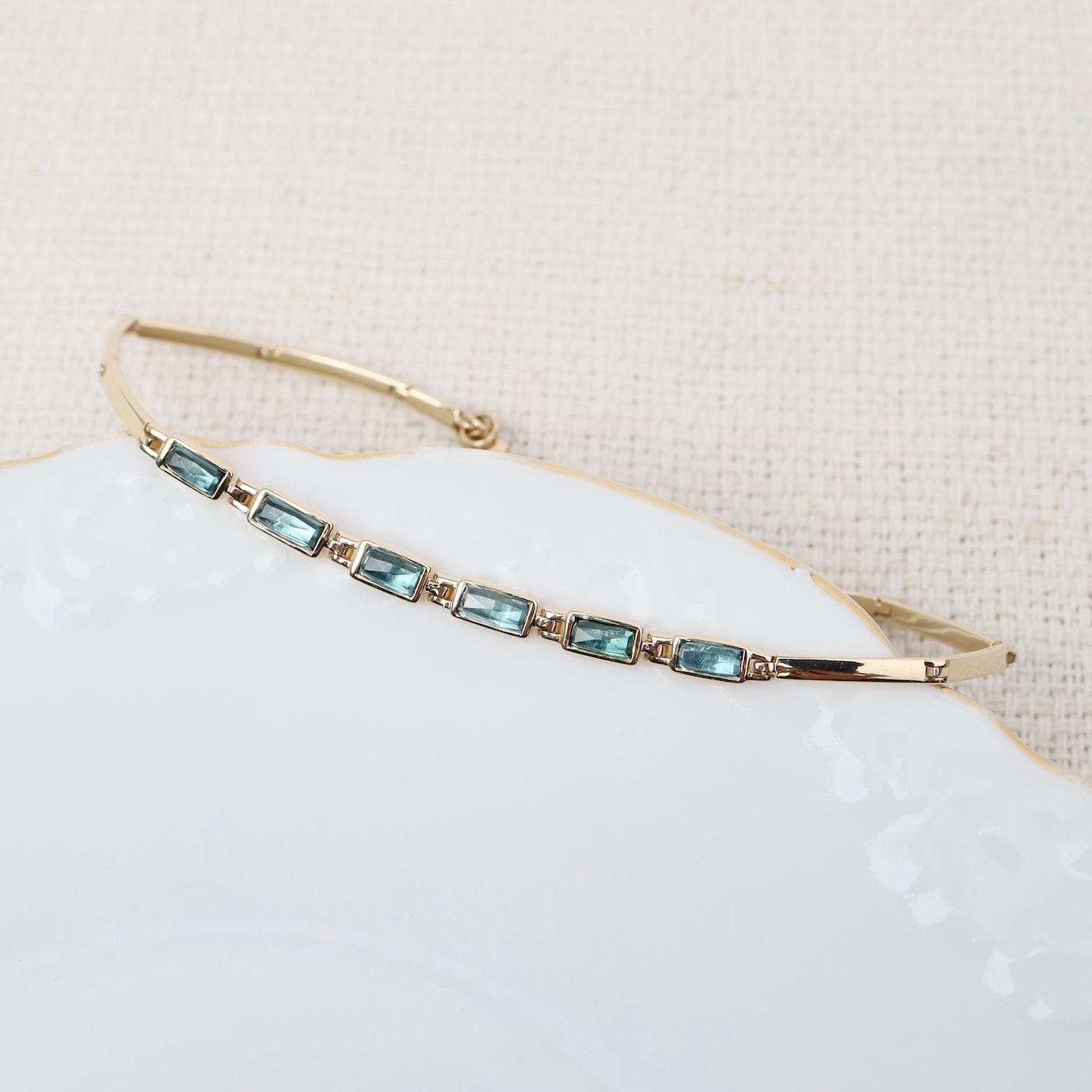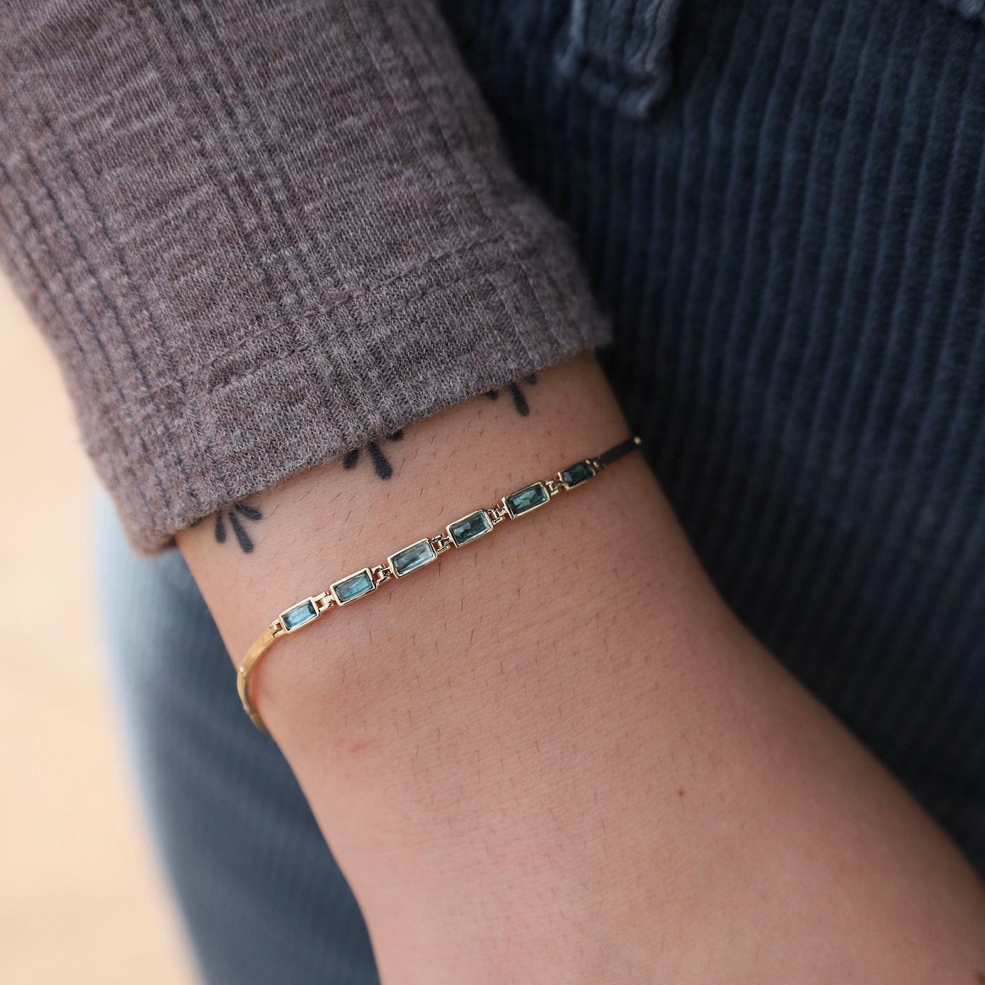 A striking study in balance and movement, this one-of-a-kind bracelet features luminous rose-cut blue-green tourmalines set within articulated 14k gold plates. Each gem catches the light with subtle shifts in hue, linked by polished gold panels that flex gracefully around the wrist. Elegant yet modern, this piece brings sophistication to any look.