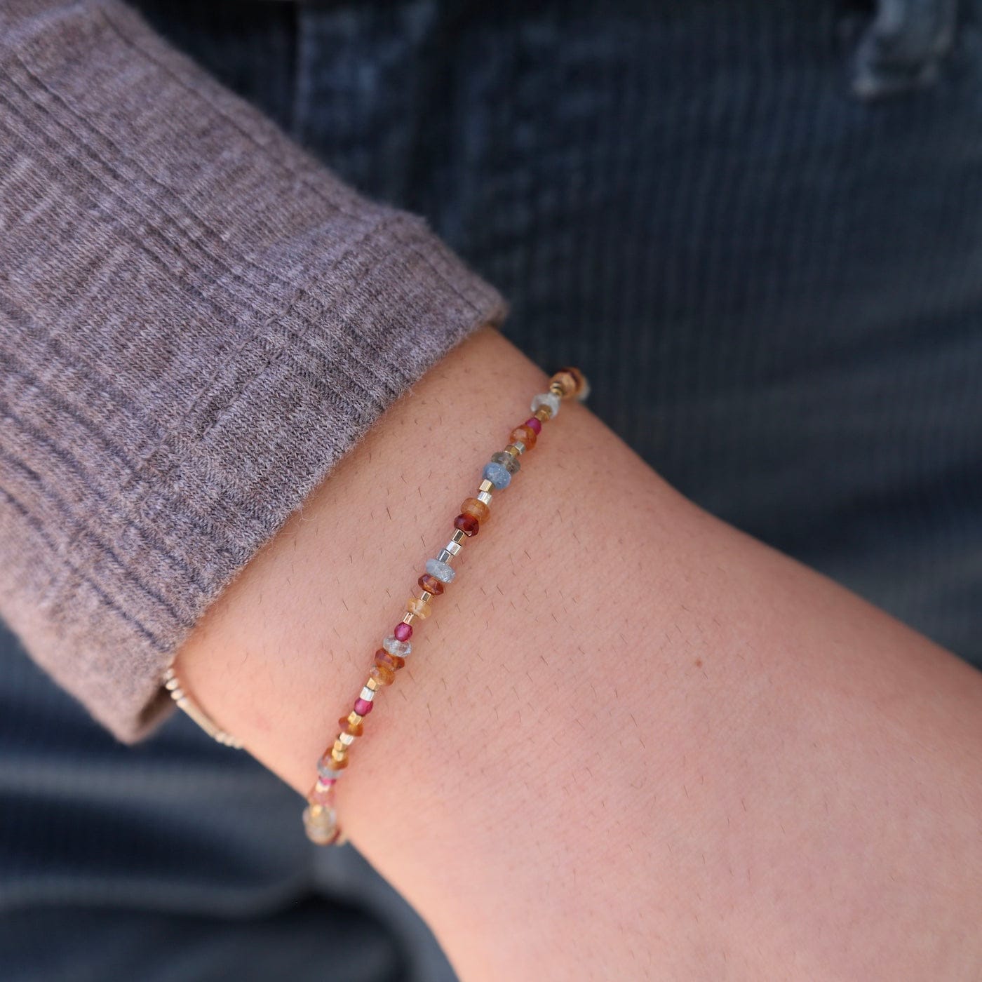 A warm, colorful mix of natural gemstones evokes the hues of a sunset in this effortless beaded bracelet. Featuring tourmaline, moss aquamarine, hessonite garnet, and citrine accented with gold-toned seed beads, this piece brings a touch of organic elegance to any stack or style.