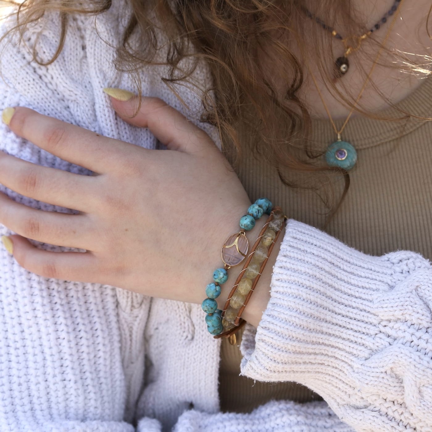 A single wrap bracelet featuring warm, glowing natural rutilated quartz stones woven on tan leather.