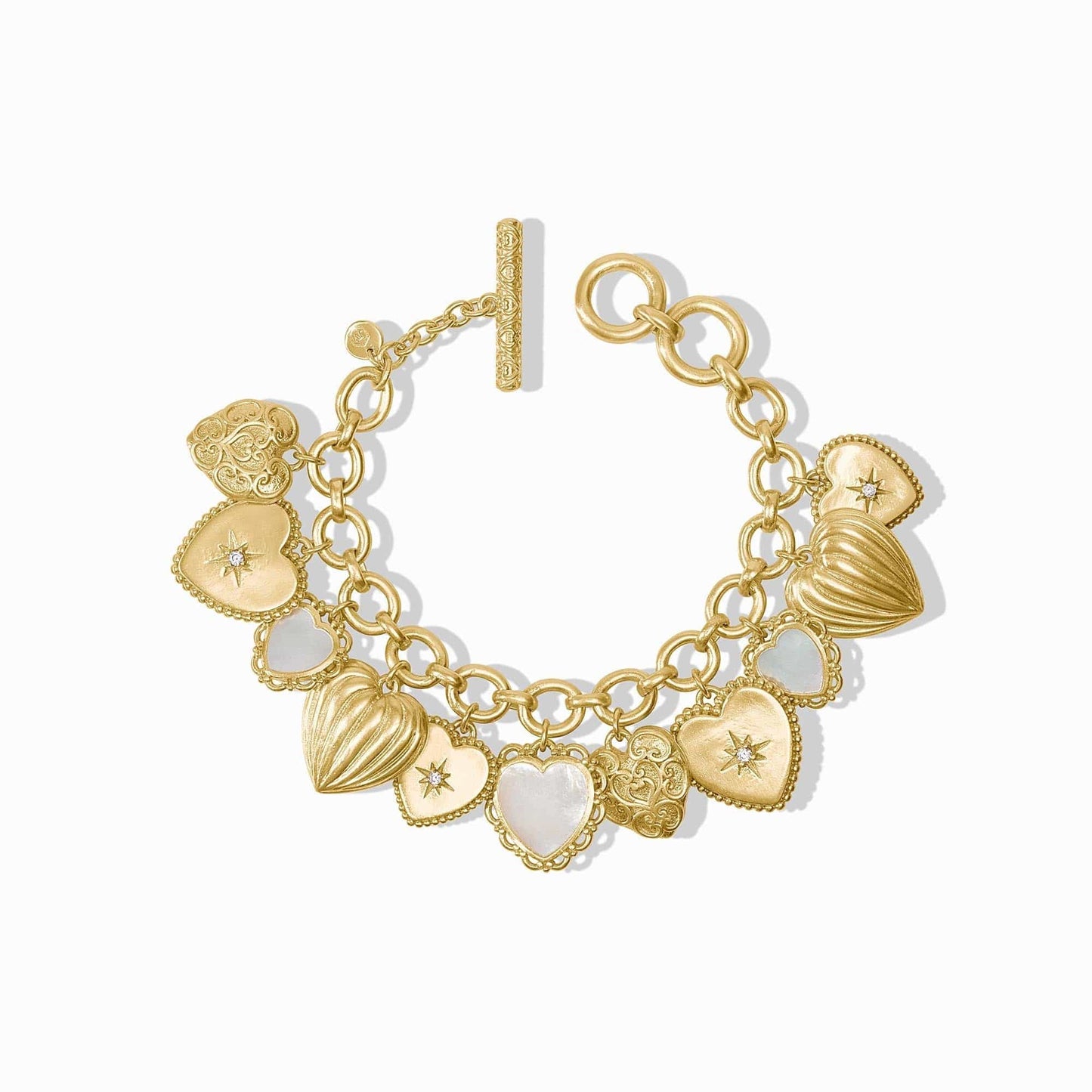 Playful and elegant, this heart-charm bracelet features a beautifully detailed mix of textured gold hearts, luminous mother of pearl, and sparkling cubic zirconia. With its luxurious 24k gold-plated finish and artful assortment of charms, it adds a romantic, statement-making touch to any look.