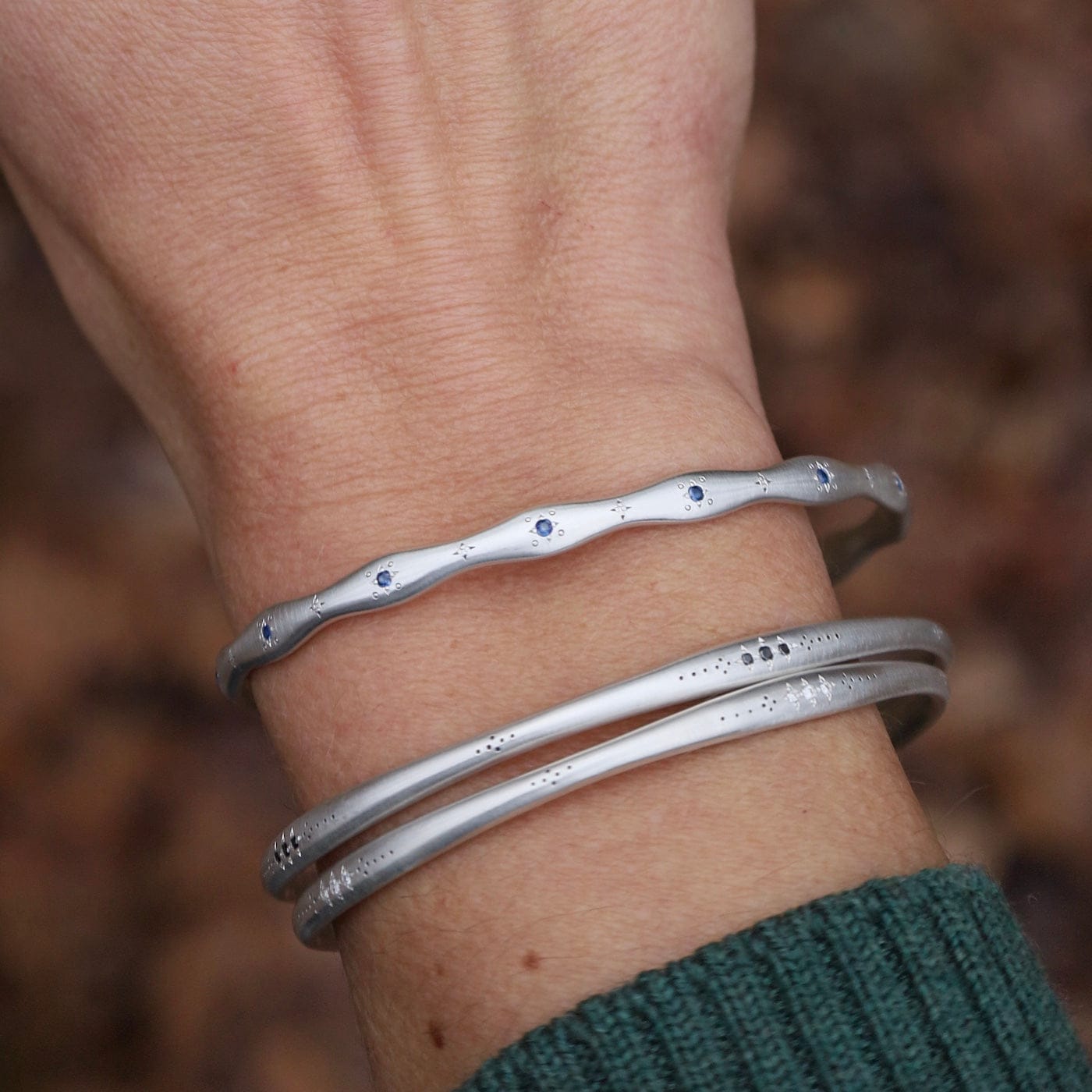 The Organic Nostalgia Bangle flows with a gentle wave along its profile, the crests adorned with trios of handset black diamonds and delicate hand-engraved details that bring a sense of calm, harmonious energy.