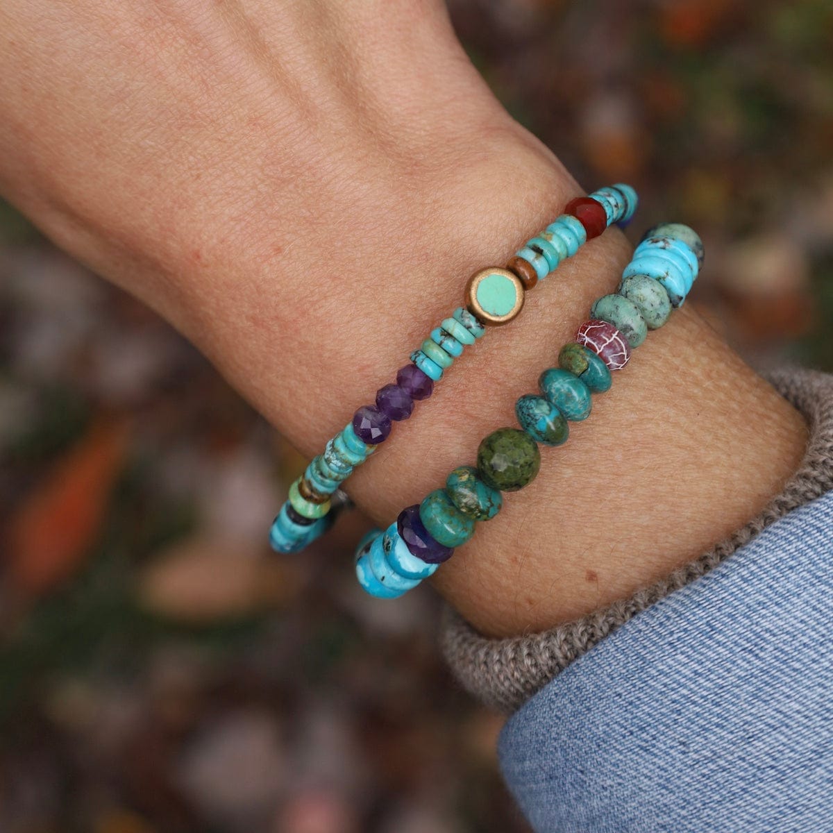 A vibrant expression of artisan color and texture, this bracelet features rich blue-green turquoise heishi beads accented by a mix of amethyst, lavender quartz, apatite, ruby, and a round green turquoise wrapped in copper. Finished with a hand-stamped Thai silver bar for an elegant bohemian touch.