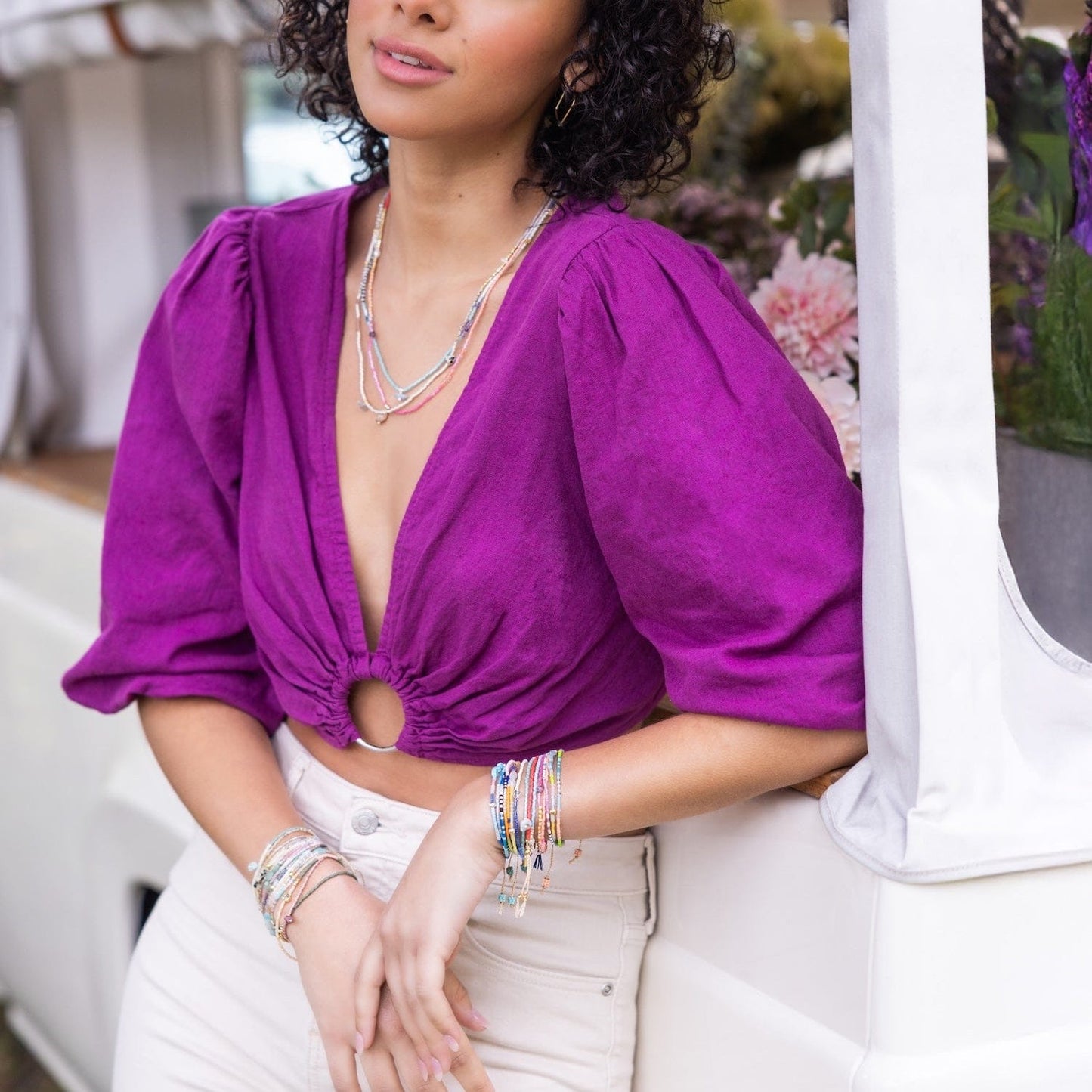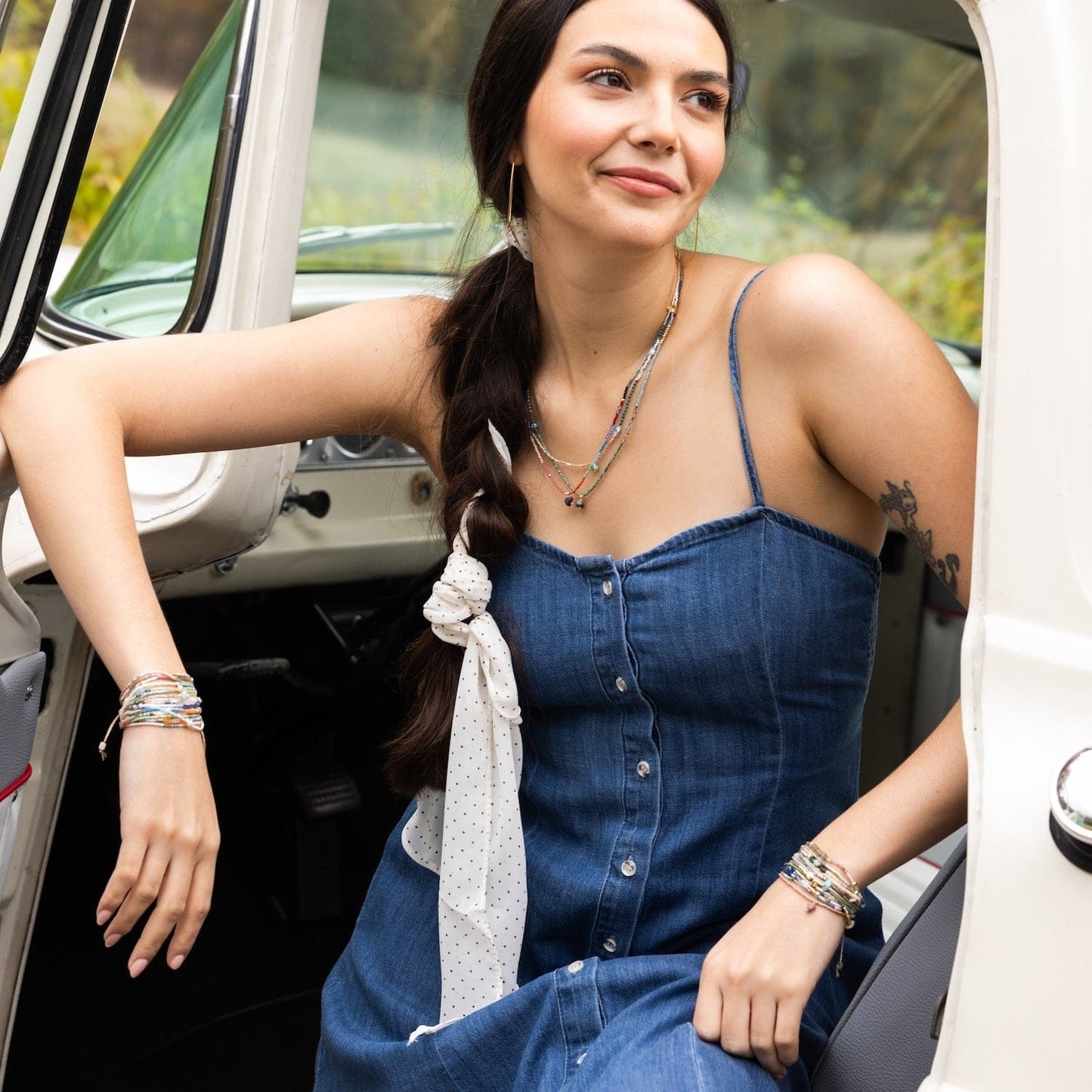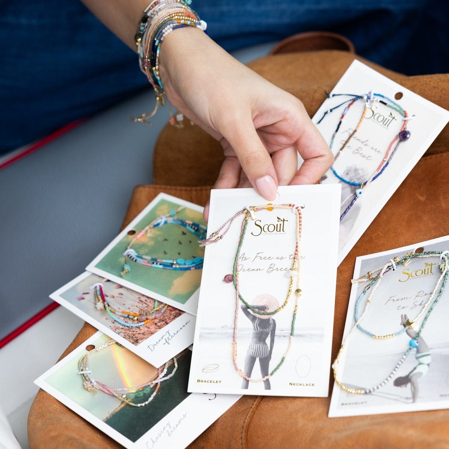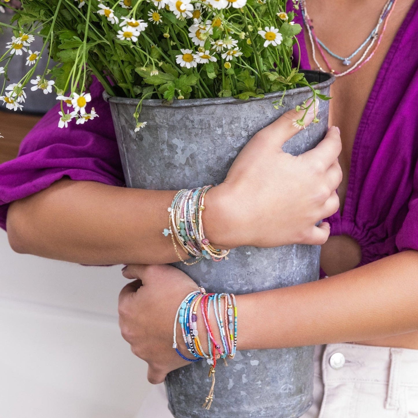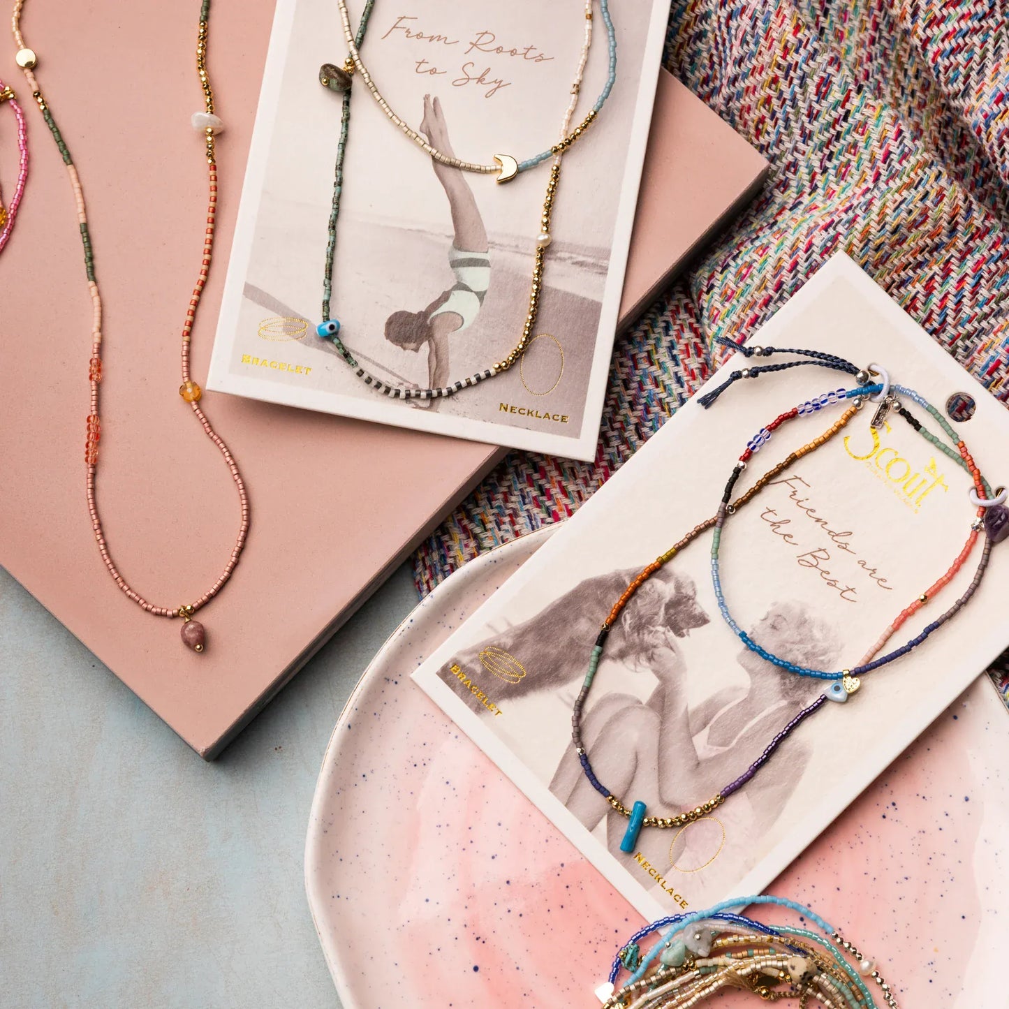 Hand strung with Japanese Miyuki Beads, organic pearls, and meaningful stones, each bracelet/necklace wrap comes packaged on a nostalgia-inspired postcard that celebrates life's journey & heartfelt connections.
