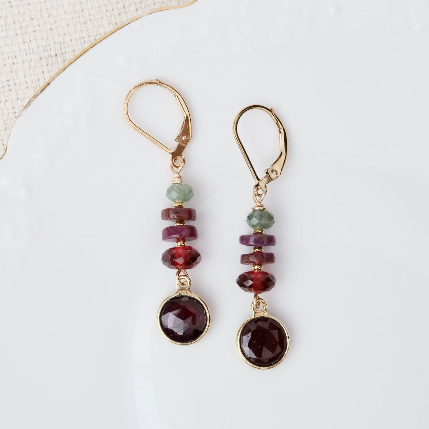 Rich and romantic, these gemstone earrings pair deep red garnets with subtle hues of green and violet. Faceted garnet rounds are accented with green apatite, ruby, and garnet beads for a luminous, layered look. Finished with gold-filled lever backs for secure, elegant wear.