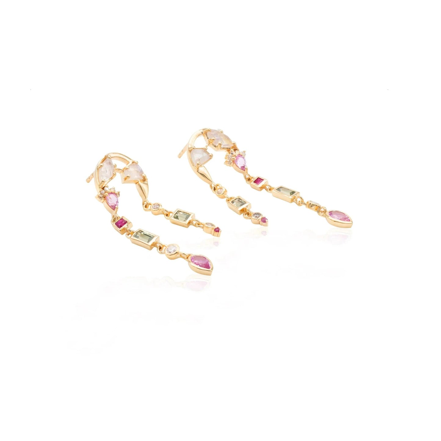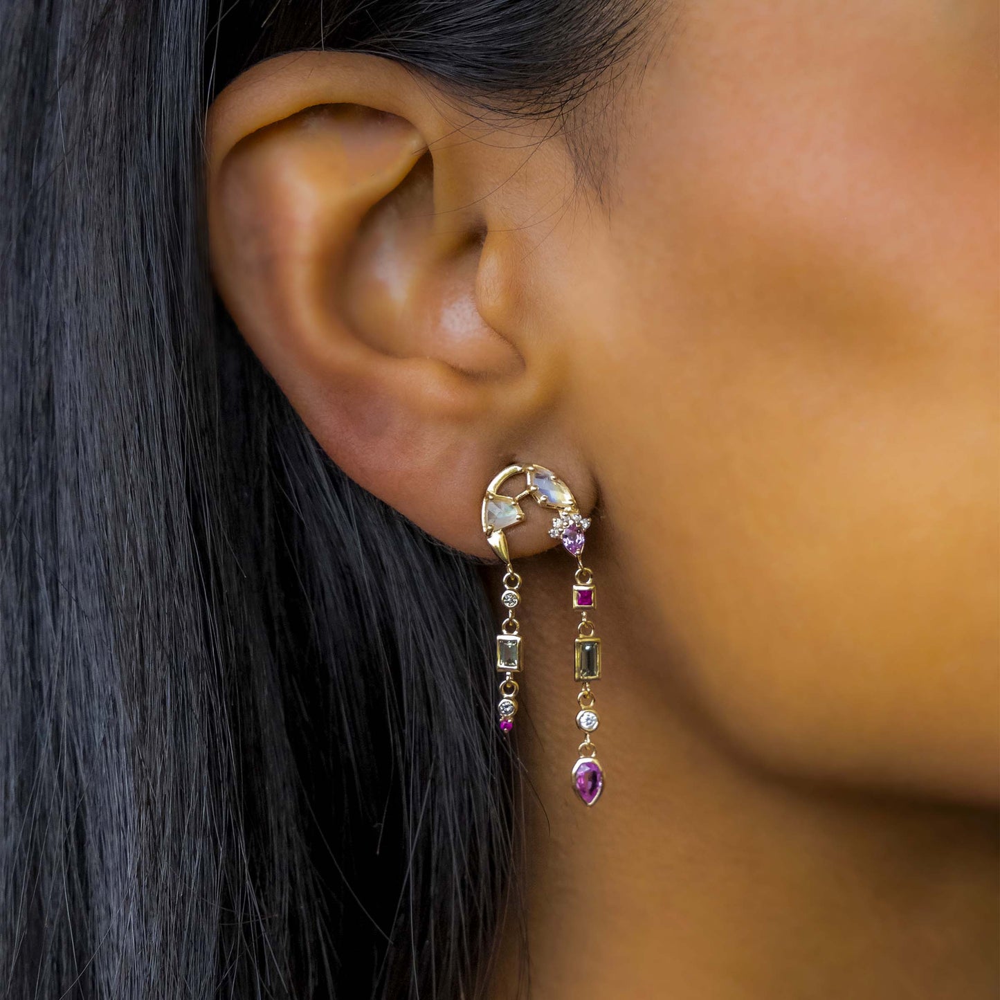 A playful combination of pink and green sapphires, pave white diamonds, and angular moonstones. Each gemstone is cut in a unique shape and size, creating a lively cascade that dances with every movement.