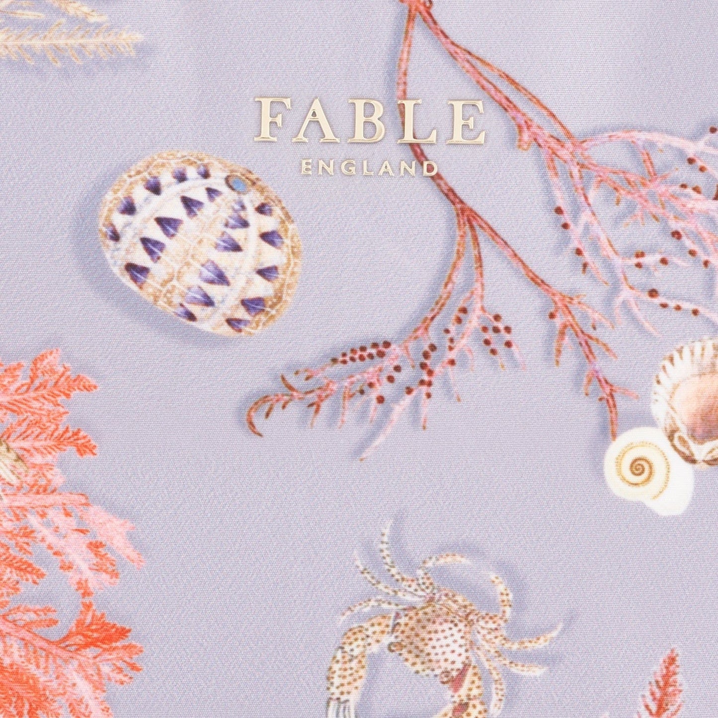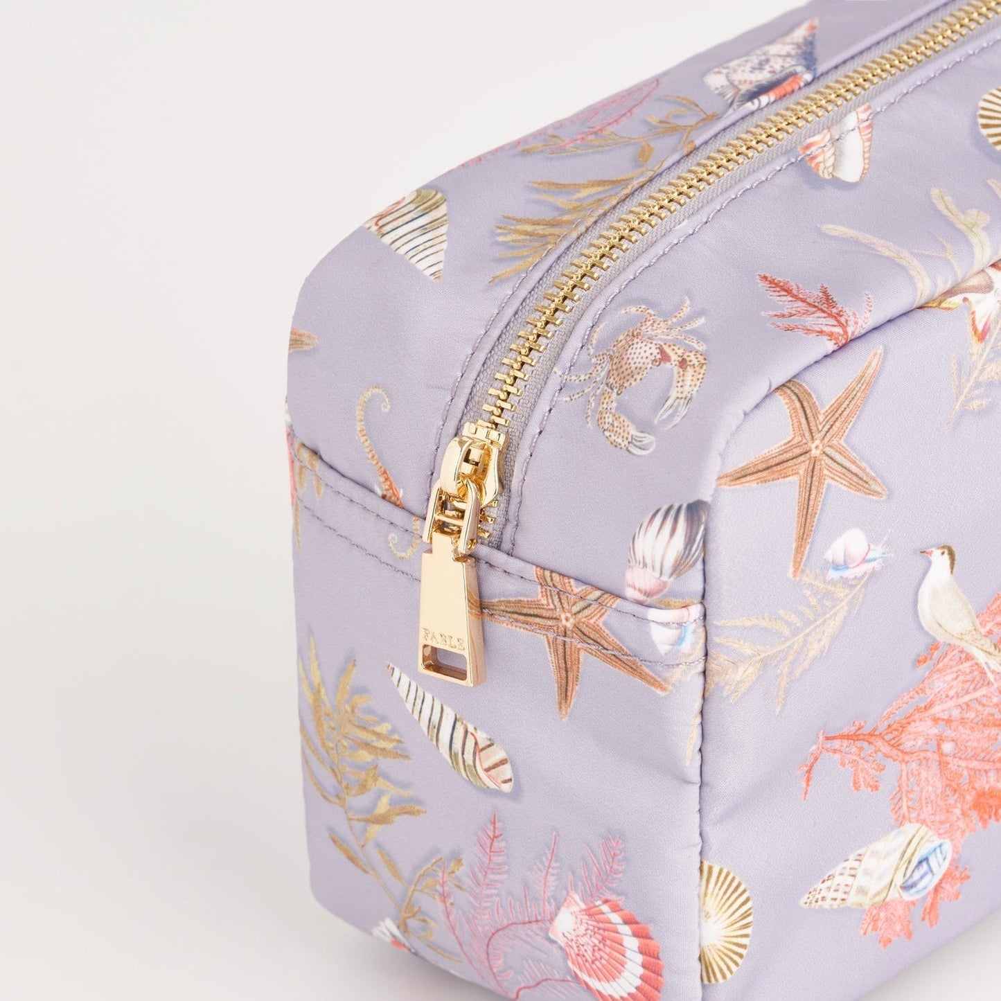 Perfectly sized for cosmetics and travel essentials, this Powder Blue Travel Pouch from the Whispering Sands collection brings a touch of coastal charm to your everyday routine. Crafted in durable nylon and adorned with flowing coral, sea creatures, and delicate shells, it captures the magic of the British seaside in a beautifully detailed print. Finished with a luxe gold-tone zip closure and a convenient leather handle, it’s as practical as it is charming.