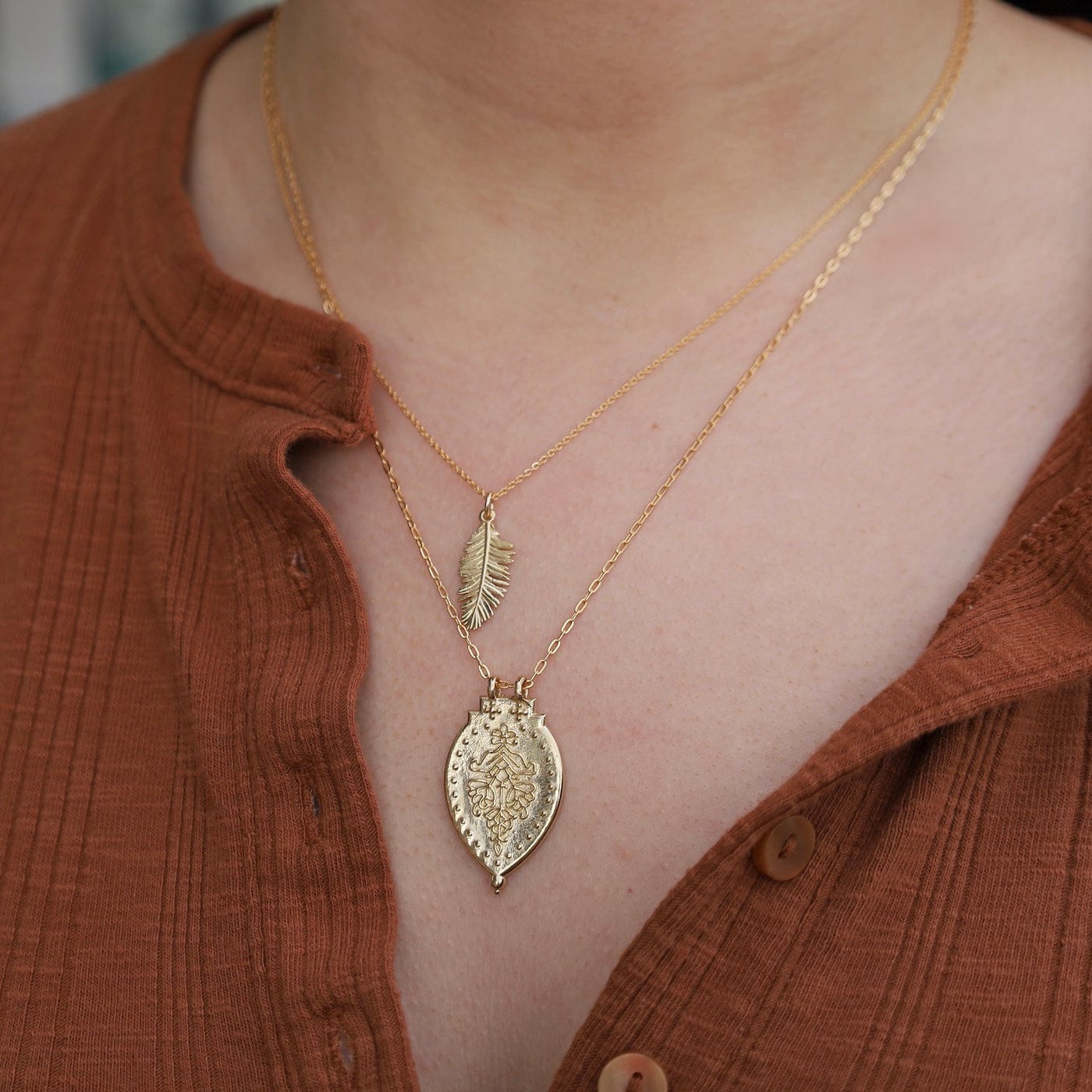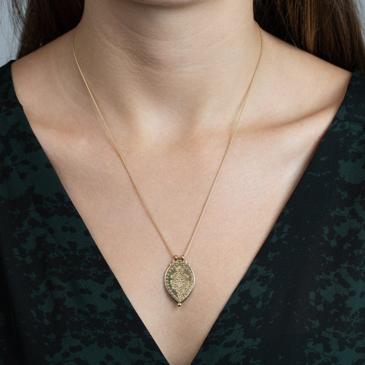 Inspired by the Hindu goddess of wealth and prosperity, the Laxmi Shield pendant is a symbol of good fortune and abundant blessings. Its shield silhouette is etched with floral motifs reminiscent of traditional Indian textiles, creating a piece that feels both sacred and beautifully storied. A meaningful talisman to wear close to your heart, handcrafted with love in Mill Valley.