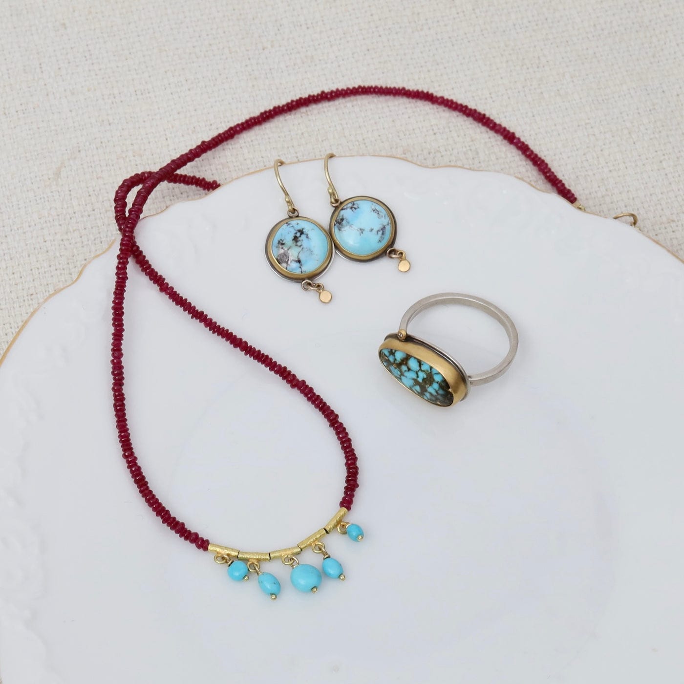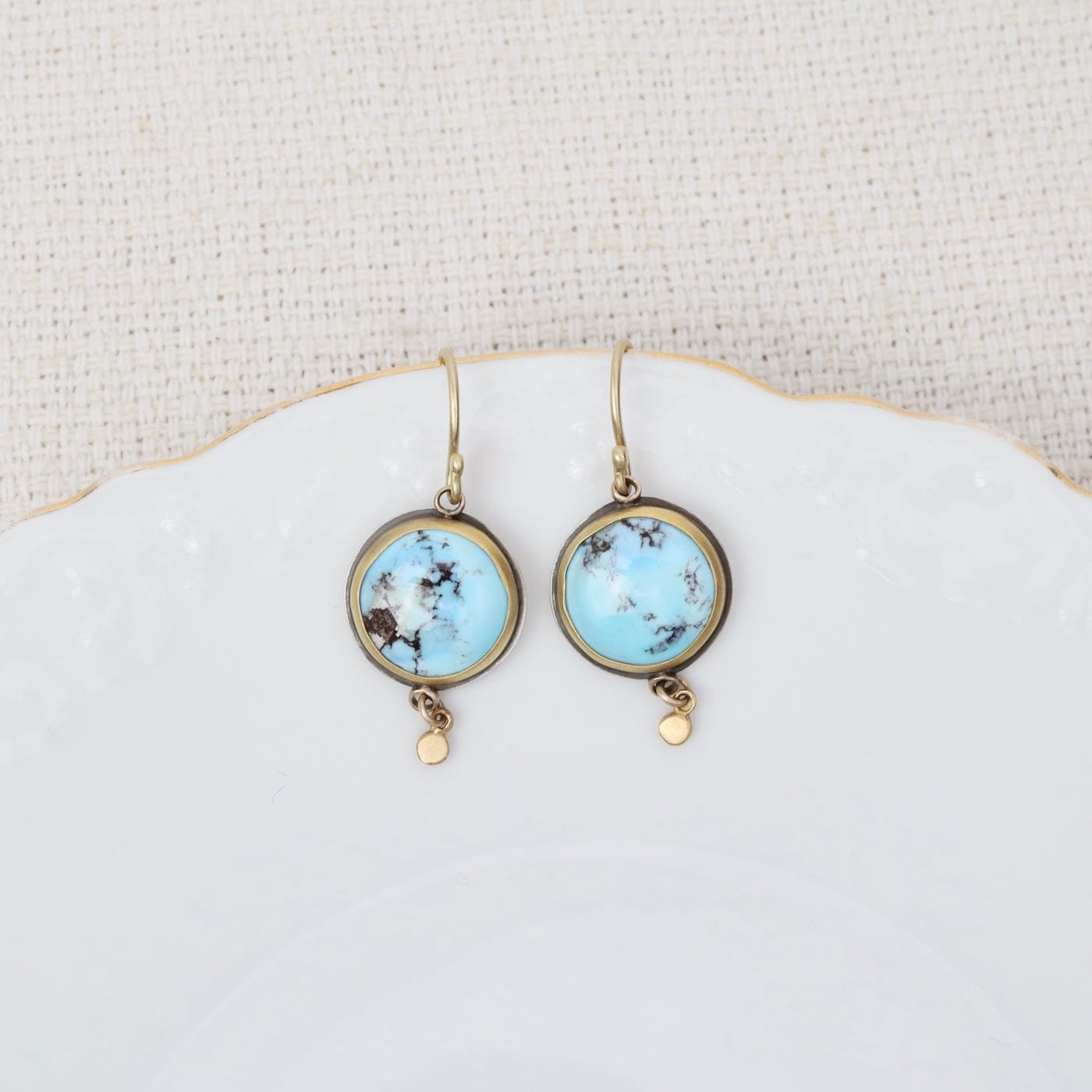 Blue, white and gray intermingle in these magical, turquoise stones. They are each set in 22k gold and accented with a hammered 22k gold disk, providing wonderful movement when worn.