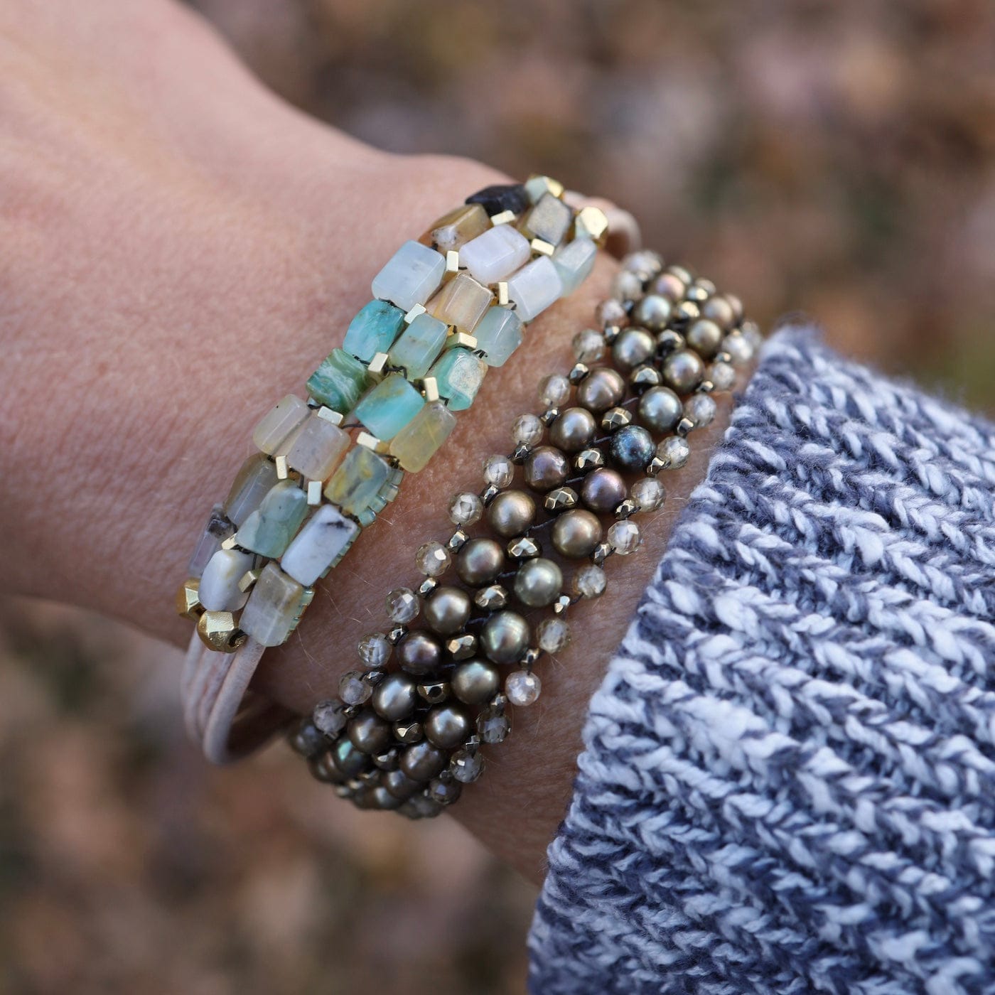 A soft strand of natural antique leather is hand woven with smooth Peruvian opal tiles in soothing tones of aqua, sand, cream, and earthy green. Each stone adds its own subtle variation, creating an organic mosaic that feels effortlessly wearable. Finished with an 8mm brass rivet clasp, this bracelet brings together artisanal texture and natural beauty in a comfortable everyday design.
