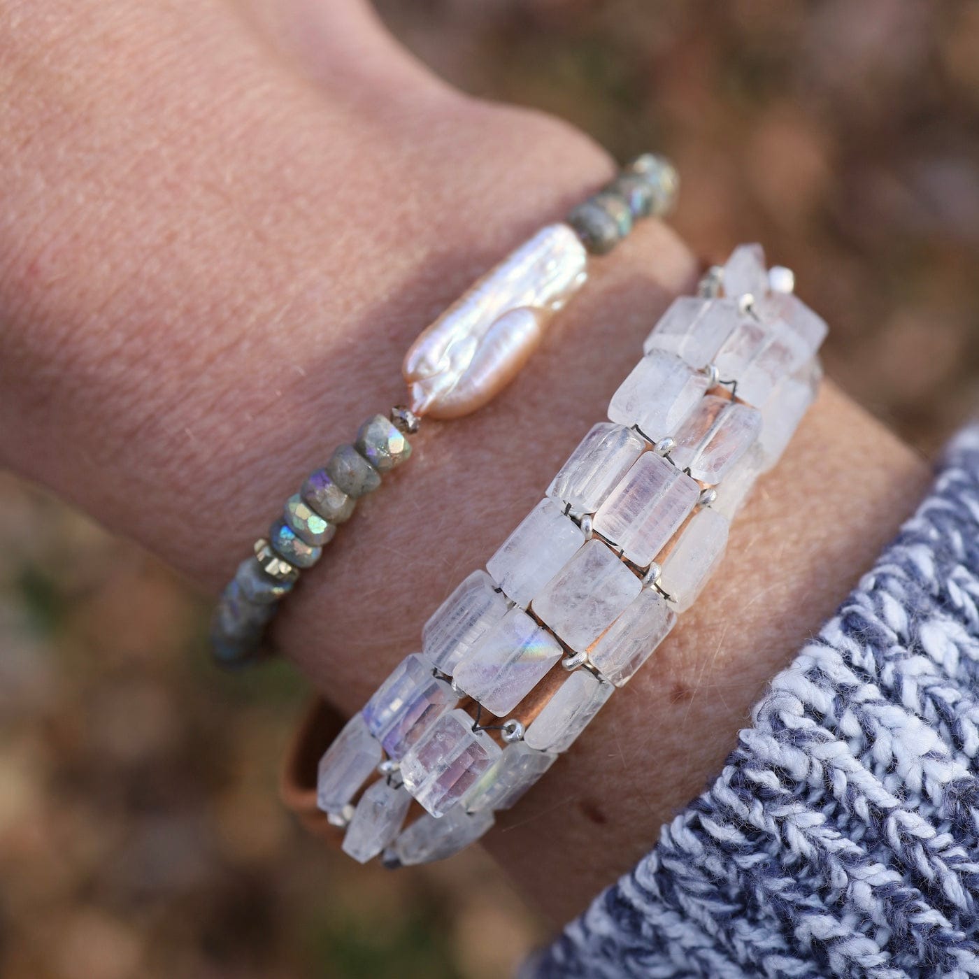 Shimmering mystic labradorite rondelles meet a luminous stick pearl at the center, creating a natural yet polished look. Finished with a smooth 2 mm button clasp for easy, secure wear.